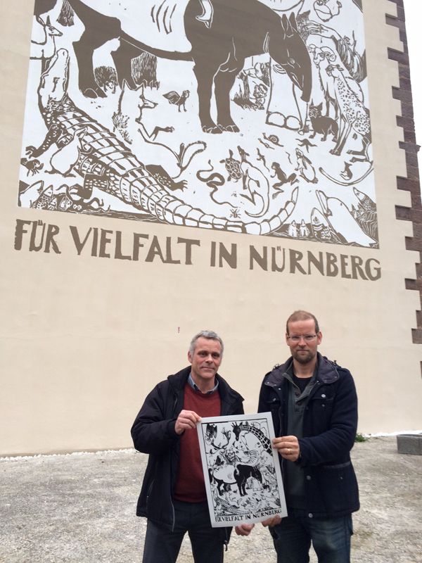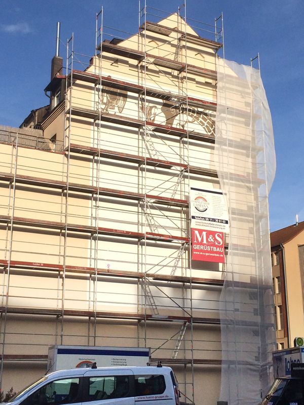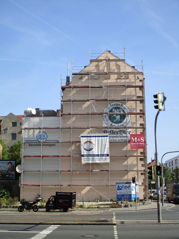 Die Fassade am Westgiebel der Äußeren Bayreuther Str. 41 in Nürnberg sollte renoviert werden. Anschließend sollte ein künstlerischer Entwurf nach DinA3-Vorlage in 10 m x 14 m Größe in Silikattechnik umgesetzt werden.