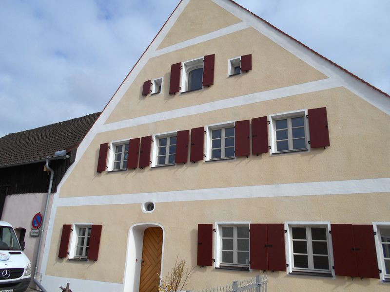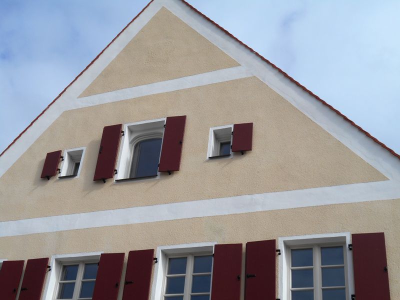Die Grundbeschichtung bestand aus KEIM Contact, das je nach Saugfähigkeit des Untergrundes mit KEIM Fixativ verdünnt und mit der Bürste kräftig in den Untergrund eingeschlämmt wurde. Grund- und Zwischenanstrich erfolgten mit KEIM Granital, dem ebenfalls KEIM Fixativ zugesetzt wurde. Der Schlussanstrich bestand aus unverdünntem Granital. Bänderungen und Fensterfaschen wurden hell getönt abgefasst.