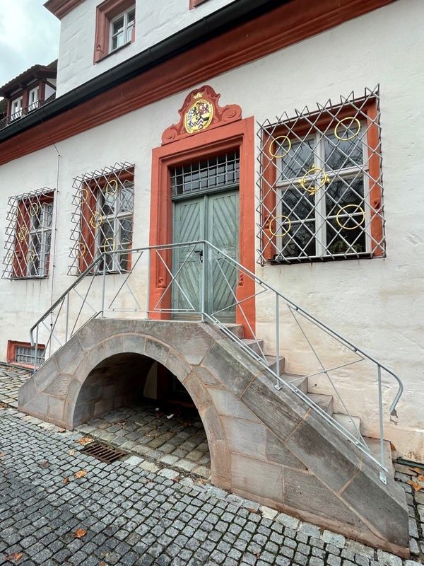 Verbrauchte Flächenputze und Hohlstellen wurden abgenommen und Anschlusskanten für den Neuputz geschaffen. Der Putz wurde artgleich ausgebessert und Risse verfüllt. Ein möglichst unkenntlicher Übergang zum Bestandsputz wurde geschaffen. Ursprüngliche Gesimse wurden wieder hergestellt.