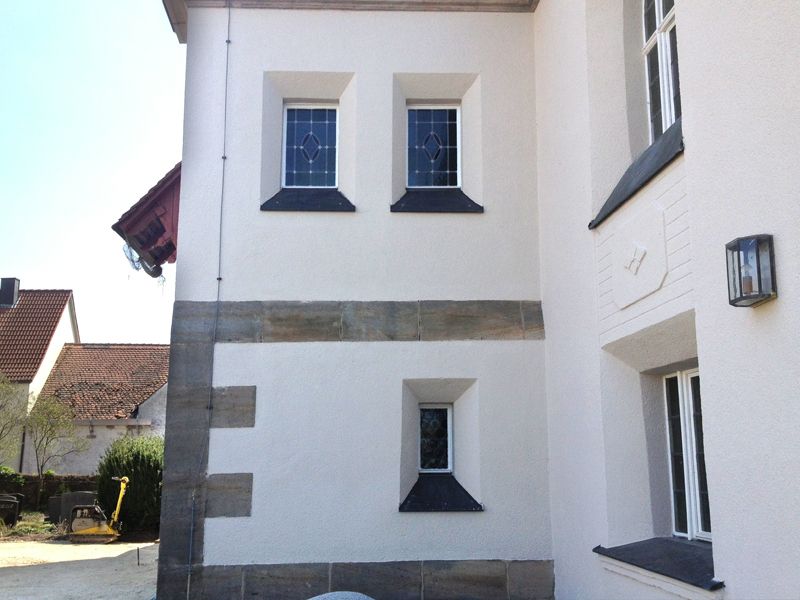 Vorab wurde eine Grundierung aus KEIM Fixativ aufgebracht. Neuputzstellen wurden mit Ätzflüssigkeit behandelt und sorgfältig nachgewaschen. Die Fassadenflächen wurden zur Erzielung einer gleichmäßigeren Oberfläche und zur Überbrückung von Haarrissen mit KEIM Contact grundiert. Zwischen- und Schlussanstrich bestanden aus KEIM Granital.