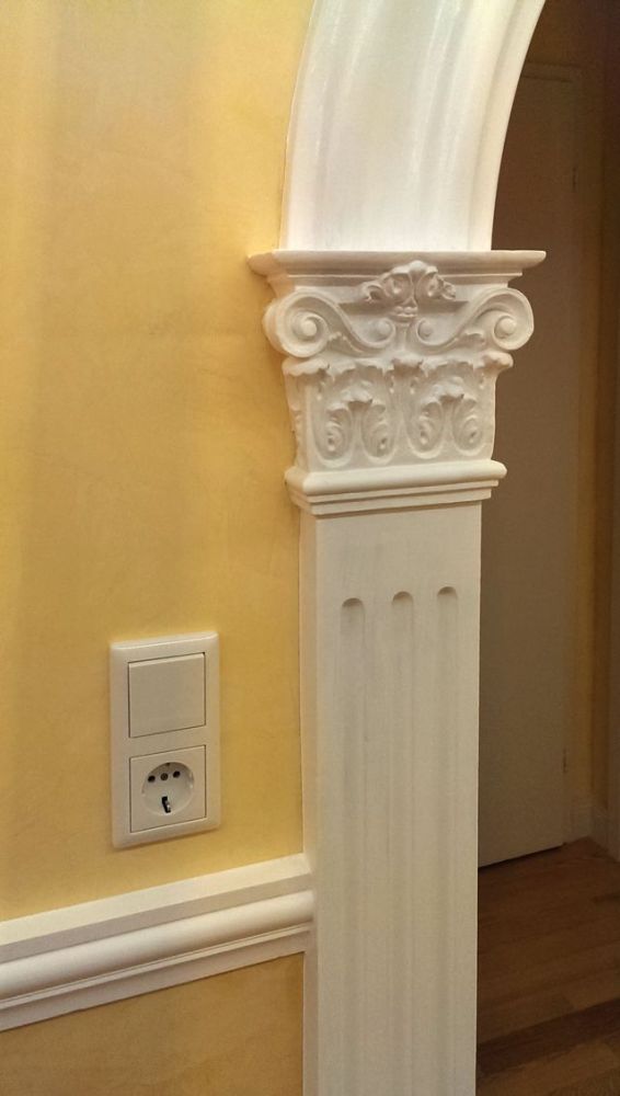 Auf dieselbe Weise entstanden die profilierte Stuckleiste, der profilierte Handlauf, Türrahmenprofilierungen und Türfersen, Kassettenprofile sowie die Pilaster mit Kannelüren.