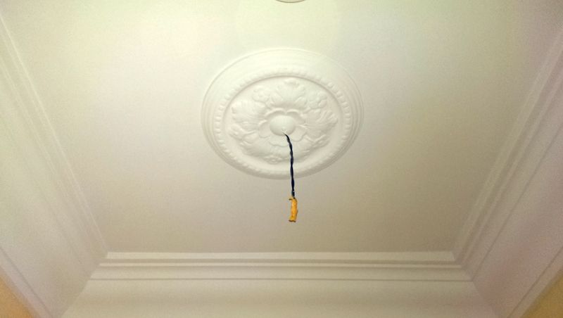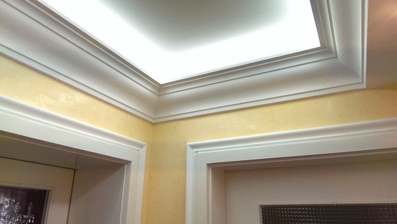 Das die Decke umlaufende Gesims wurde so als profilierte Stuckleiste in Zugtechnik mittels Schlitten aus Gips hergestellt und in mindestens drei Zügen inklusive Gewebeeinlage aufgebaut.