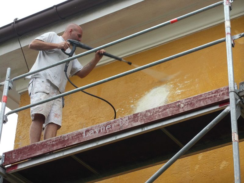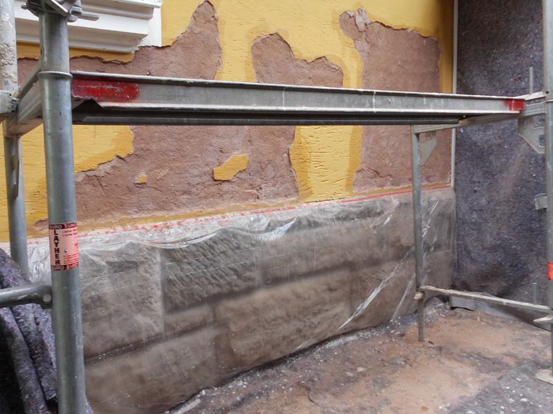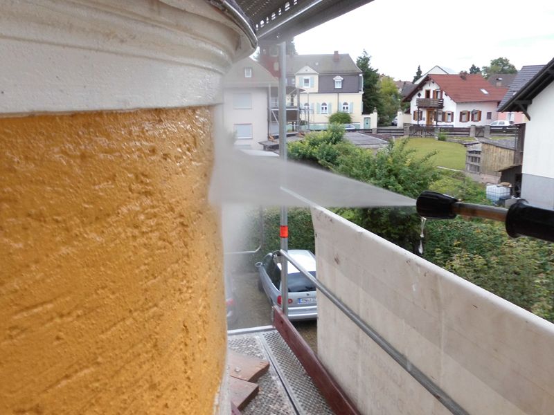 Die Fassade wurde gereinigt und in Teilbereichen von biogenem Befall befreit. Salzbelastete und nicht haltbare Altputzflächen wurden entfernt. Trennschnitte garantierten die Sicherheit von umliegenden, standfesten Bereichen.