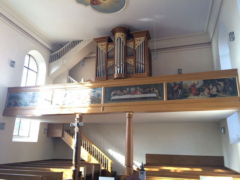 Die Emporenbrüstungen wurden außen und innen überarbeitet und aufgefrischt. Altanstriche wurden mit leichtem Anlauger gereinigt und nachgewaschen.