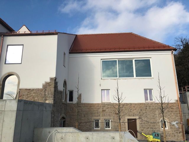 Die Fassade wurde gereinigt und so für die Putzarbeiten vorbereitet. Saugender Untergrund wurde tiefengrundiert.
