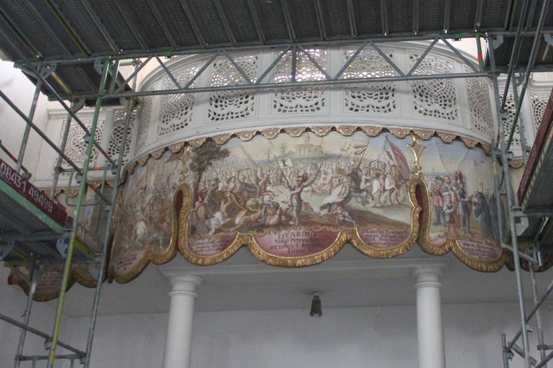 Risse und Fehlstellen im Bereich der Malerei und der Stuckierungen wurden mit Kreide-Leimkitt bzw. Kalkmörtel gekittet. Die Oberfläche wurde in Niveau und Struktur ihrer Umgebung angepasst.
