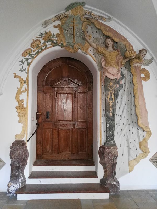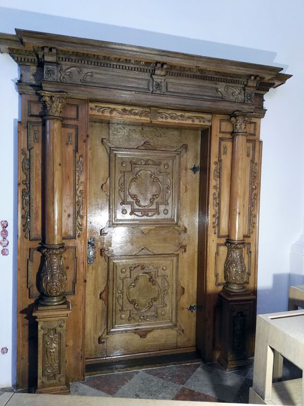 Zugangstür zum Kreuzgang, verzierte Zugangstür zum Nebenraum einschließlich profilierter Bekleidung