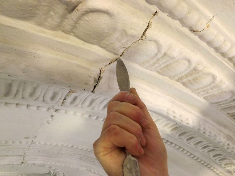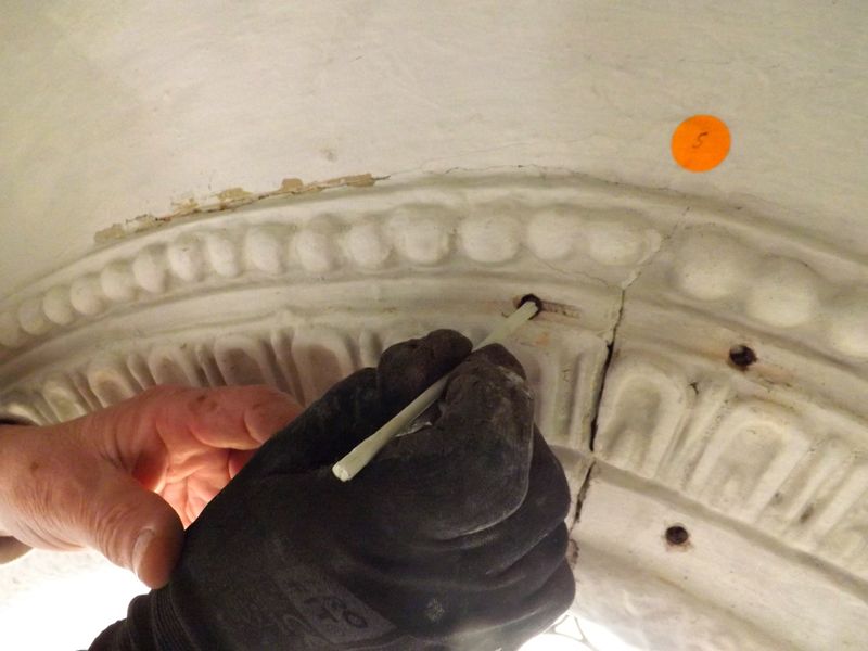 Gelockerte Stuckprofile wurden statisch durch Vernadelung gesichert. Bohrungen von 6mm Durchmesser wurden bis in das Ziegelgewölbe eingebracht. Daraufhin wurden mit Epoxidharz laminierte Kohlefaserrundstäbe ca. 5 mm unter Oberflächenniveau in die Bohrungen eingesetzt und mit Epoxidharz im Bohrloch verklebt.