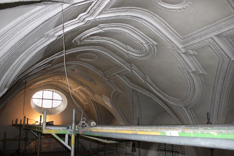Emporenrückwand Stuckprofil, Stuckprofile um die Fenster, Stuckprofile im Übergang Wand-Decke, Stuckierung um die Deckenspiegel, Stuckprofile Gurtbogenleibungen Seitenkapellen