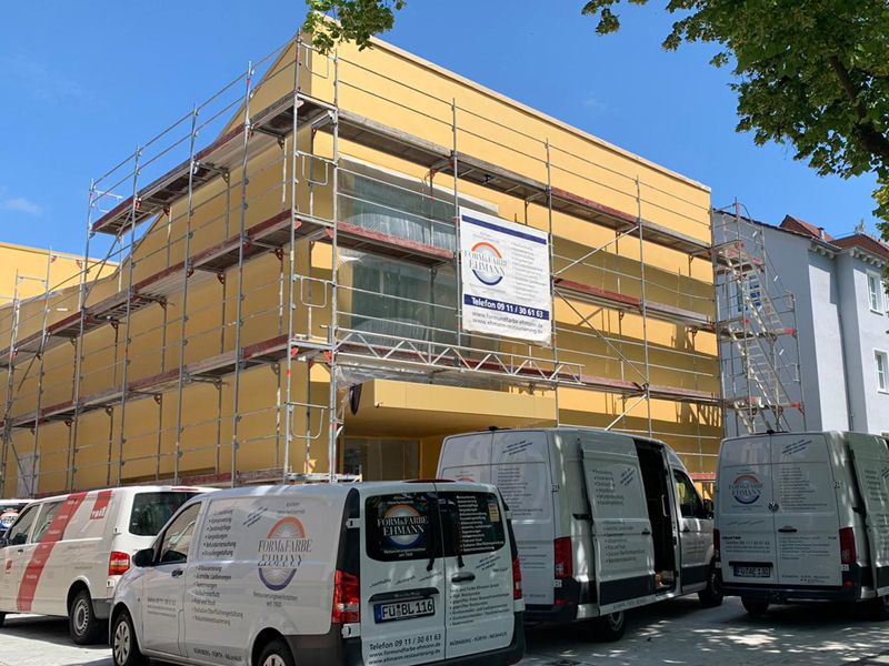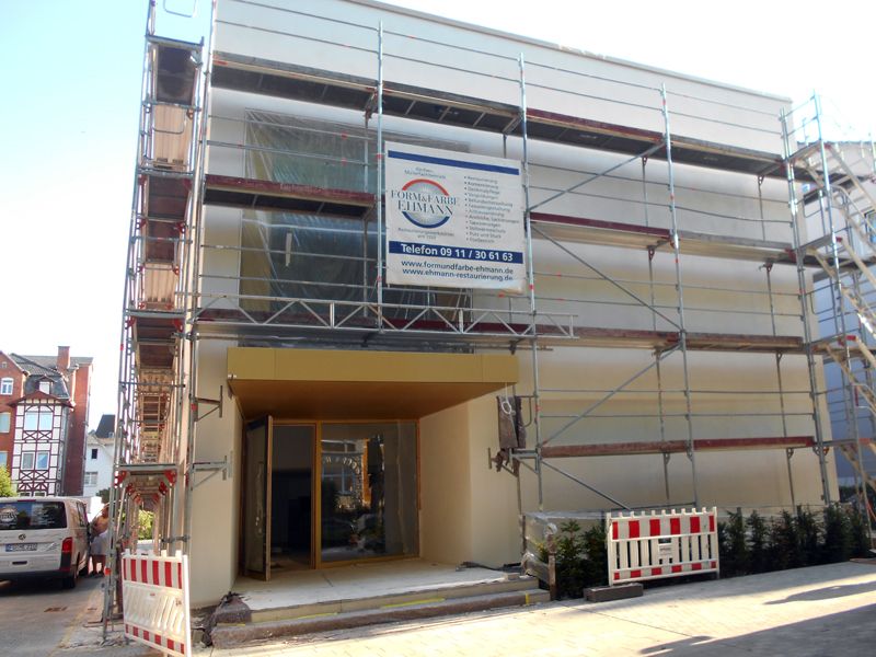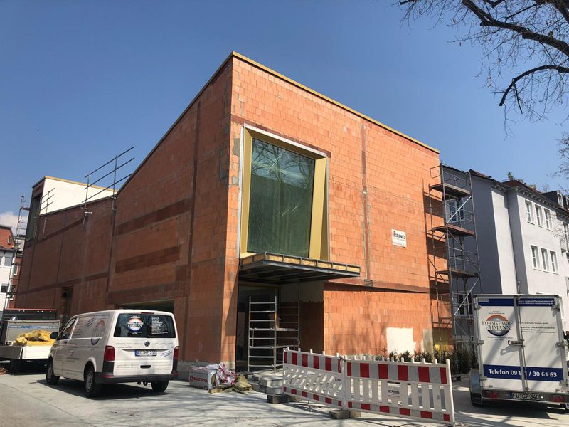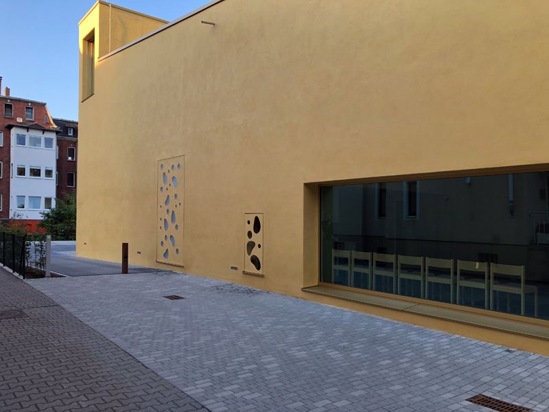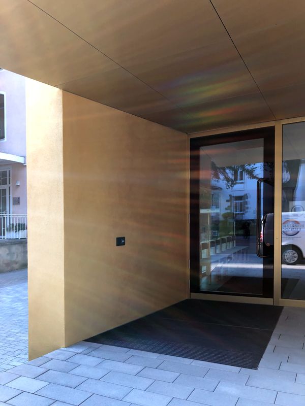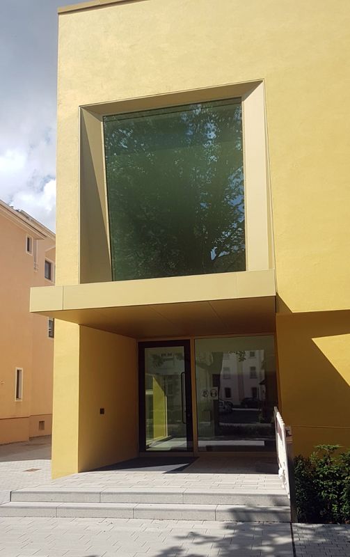 Der Anstrich der Fassade erfolgte im KEIM Soldalit-System. Im Anschluss an die zweifache gelbe Grundierung wurde eine Design-Lasur in Gold aufgetragen, was aufwändige Detaillösungen an Fenster- und Türanschlüssen notwendig machte. Die Verschattungselemente zum Kirchensaal wurden ebenfalls beschichtet.