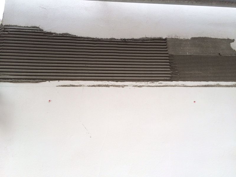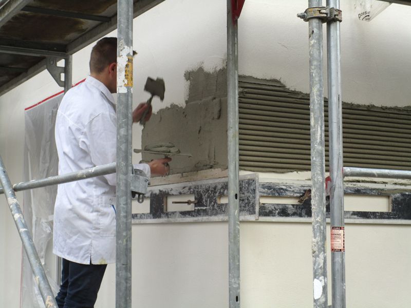 Das Mauerwerk wurde mit KEIM Porosil Kalkzementleichtputz verputzt. Darauf folgte der Kammzug mittels eigens hergestellter Zugschablonen. Anschließend wurde der Kammzugputz mit einem langhaarigen Pinsel gestrichen, um auch die Vertiefungen der feinen Fugen zu erreichen.