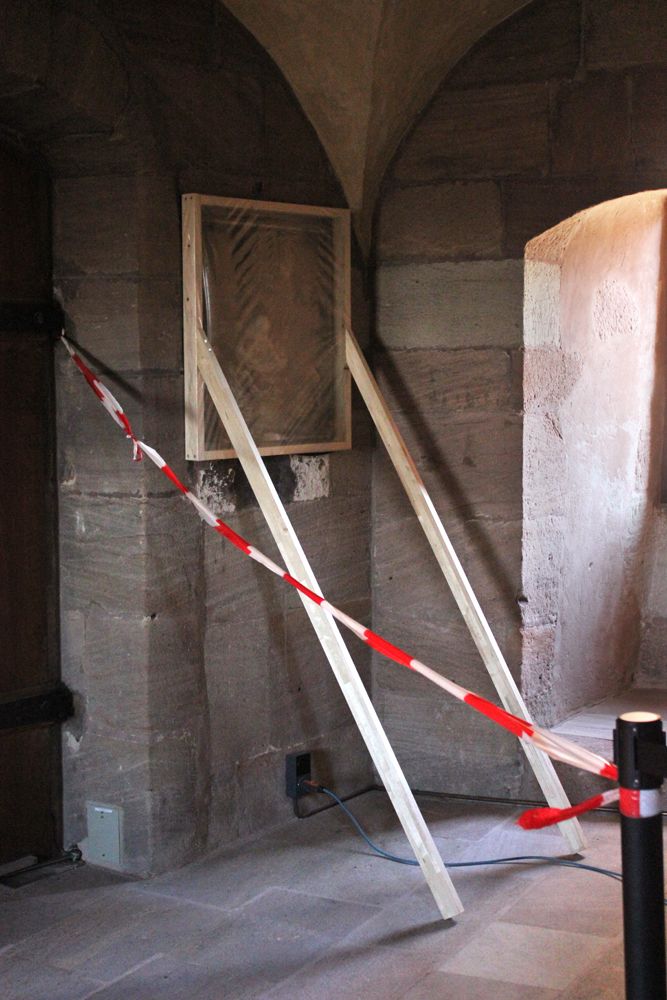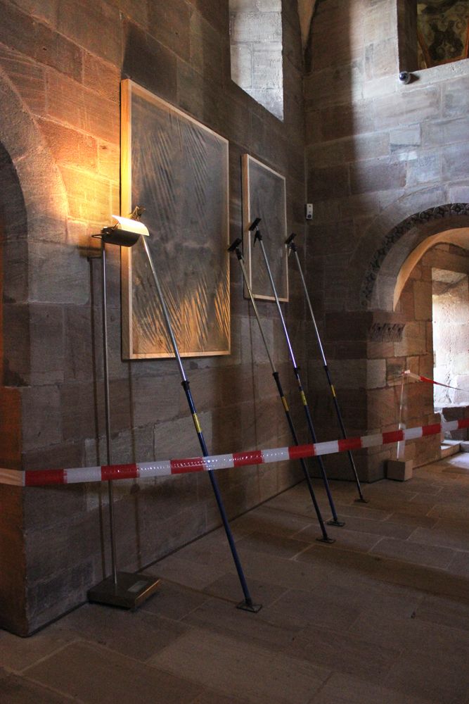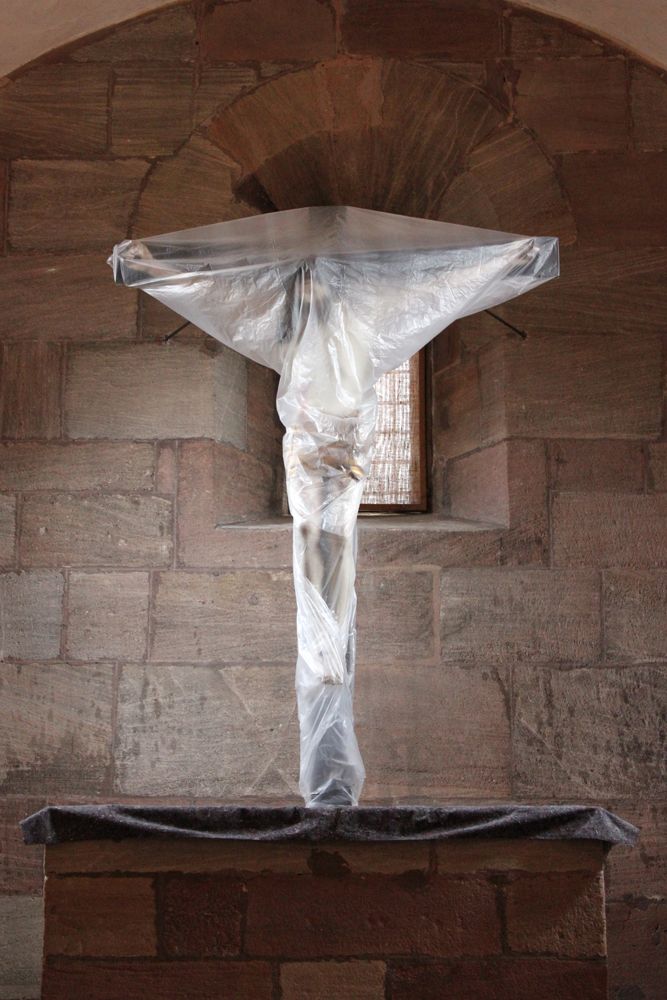 Es sollten keinerlei Befestigungen an Architektur oder Ausstattungsgegenständen angebracht werden. Im Falle der Bilder und der nicht abgenommenen Figuren in der Oberen Kapelle wurde überstehende Folie locker, doch großzügig hinter den jeweiligen Gegenstand eingebracht, so fixiert und staubdicht gemacht.