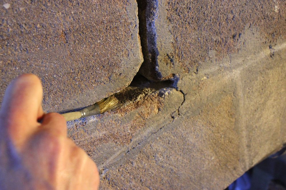 Mürbe oder lose Fugen innerhalb der Sandsteinflächen wurden ausgebaut und mit Staubsaugern von Stäuben und losem Material befreit. Daraufhin wurden die Fugen- und Rissflanken mit Kieselsäureethylester verfestigt.