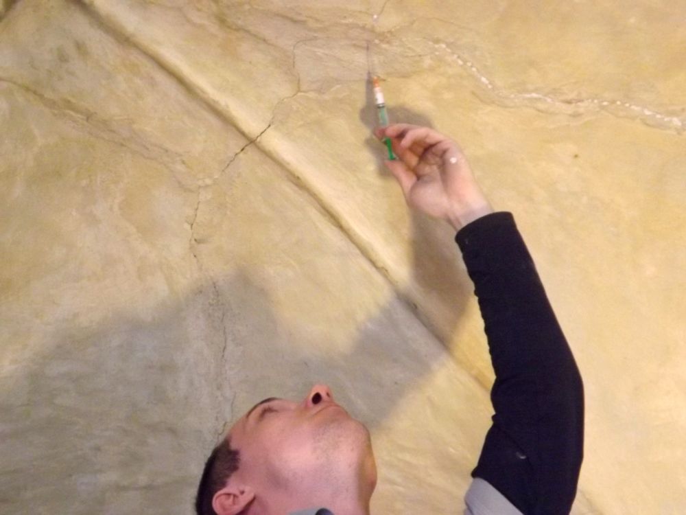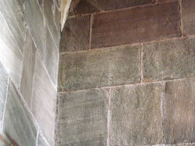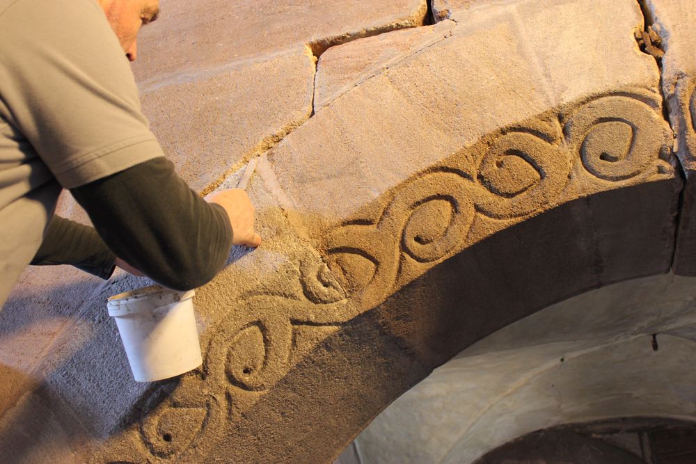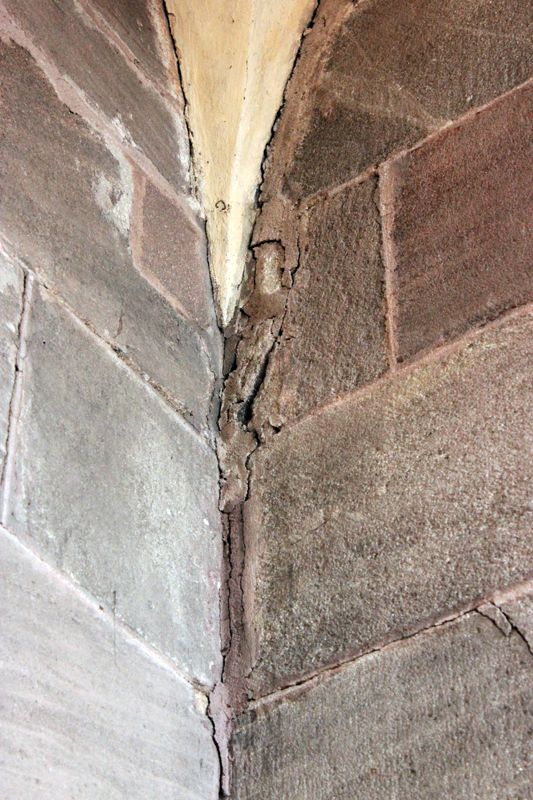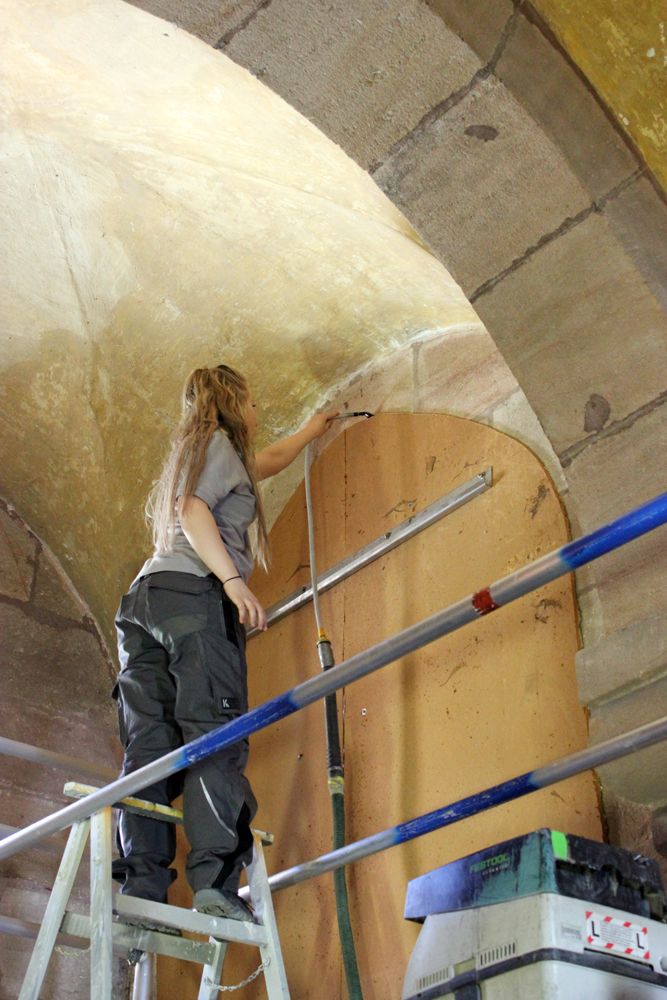 Risse im Gewölbe bei der Eingangstür wurden leicht konisch geöffnet und durch Aussaugen gesäubert. Nach Verfestigung sandender Rissflanken erfolgte die Verfüllung hohlliegender Bereiche und die Vergelung der Risse in einem mehrstufigen Injektionsverfahren. Zuerst wurde eine Vorfestigung (Remmers KSE 100) eingebracht, anschließend folgte die Injektion von Ledan D1 in abgetimmten Verdünnungsstufen. Die so vergelten und hinterfüllten Risse wurden daraufhin geschlossen und durch Retusche an den umliegenden Bestand angeglichen.