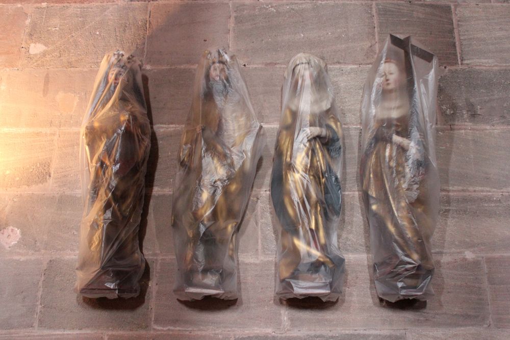 Die Madonnenfigur an der westlichen Wand unterhalb der Herrscherempore wurde, um eine sichere Gerüstpositionierung zu gewährleisten, abgenommen und im selben Raum allerdings innerhalb des per Alarmanlage geschützten Bereiches sicher auf Poly-Pad gelagert. Poly-Pad sind anpassungsfähige Vakuumkissen zur druckfeien Stabilisierung und Polsterung sensibler Gegenstände. Die in den Kissen vorhandene Kugelmasse passt sich formschlüssig der Kontur des Objekts an. Über ein Ventil werden die Pads evakuiert und in der modellierten Position verfestigt. Sie sind chemisch inert, widerstandsfähig und reißfest.