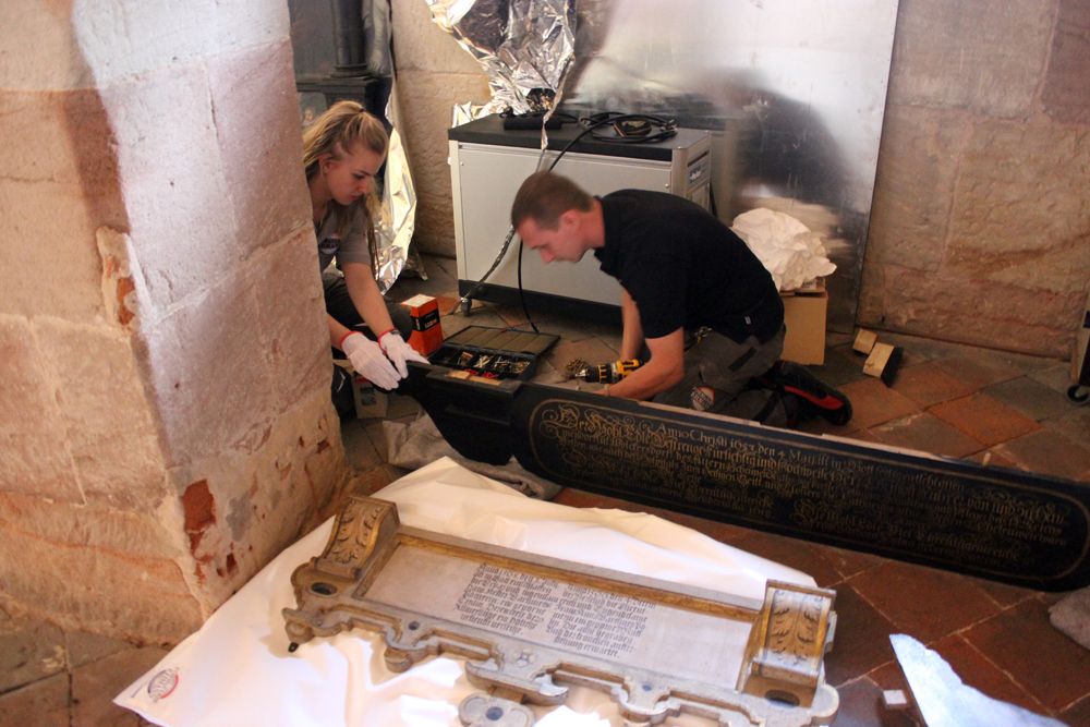 Die von Anobien befallenen Epitaphien in der Unteren Kapelle wurden schließlich abgenommen, eingehaust und begast. Um die unausgesetzte Atmung und Gasaufnahme[nbsp]der Holzwürmer zu gewährleisten, wurde die Einhausung beheizt. Nach angenommen ausreichender Standzeit wurden der Einhausung Probeblöcke entnommen. Die Zählung verendeter Würmer erlaubte die Enthüllung der Epitaphien und die Remontage an ihren angestammten Platz, nachdem Bilder und Wandflächen mit Pinseln und Staubsaugern gereinigt worden waren.