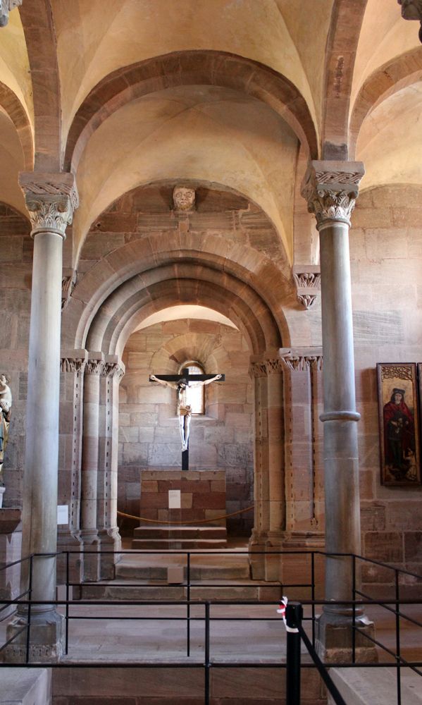 Der obere Teil der Doppelkapelle, die sogenannte Kaiserkapelle, hat für die Romanik sehr ungewöhnliche Proportionen. Vom Palas kommend tritt der Besucher aus dem niedrigen Emporengewölbe mit seinen stämmigen Säulen in einen lichten, nach oben strebenden Kirchenraum mit vier bemerkenswert schlanken Säulen aus marmorähnlichem Kalkstein.