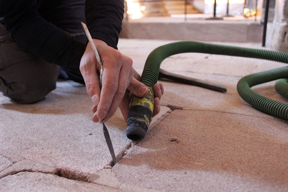 Auch im Boden der Oberen Kapelle wurden defekte oder lose Fugen ausgebaut und durch Aussaugen von Stäuben und nicht mehr anhaftendem Material befreit. Nach der Verfestigung der Flanken mit Kieselsäureethylester wurden die Fugen mit Sandsteinmörtel geschlossen. Anschließend folgte die Retusche und das farbliche Angleichen an den umliegenden Bestand. Als Material kam auch hier das KEIM Restauro-System zum Einsatz.