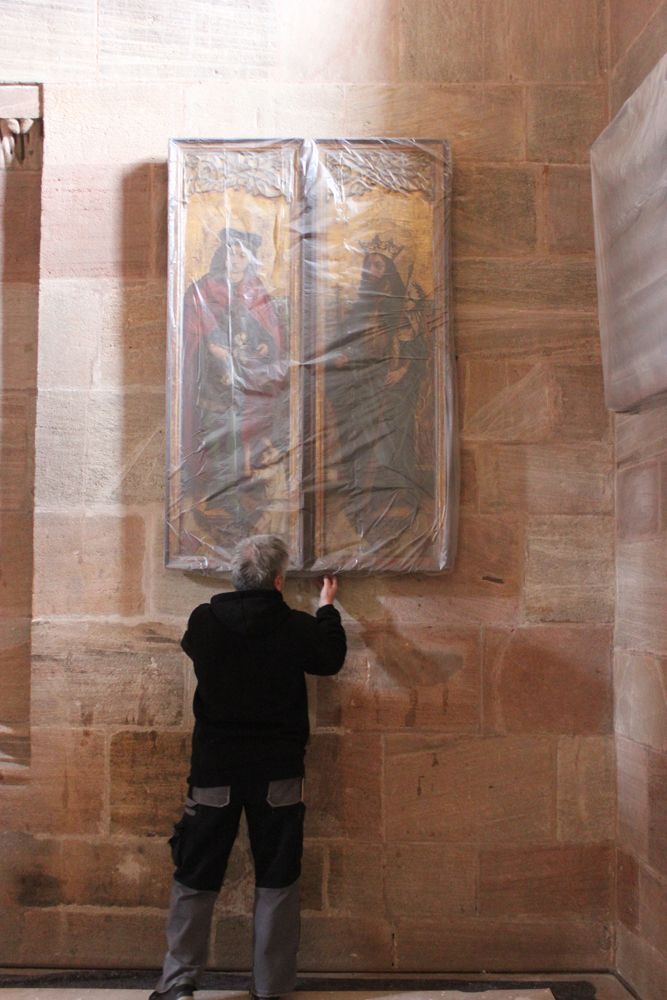 Eine Ausnahme bildeten hier die beiden Epitaphien, für die Tyvek Soft PE Vlies verwendet werden sollte. Die beiden von Anobienbefall betroffenen Bilder sollten länger umhüllt bleiben, um die Ausflugszeit des Holzschädlings zu überbrücken, weshalb hier diffusionsoffenes Abdeckmaterial angezeigt erschien.