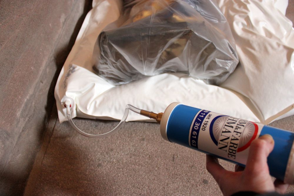 Die kraftschlüssige Injektage und Verfüllung der Fugen und Risse erfolgte mit Hasit 202. Anschließend wurden sie im KEIM Restauro-System mit Sandsteinmörtel geschlossen und mit Lasuren farblich an den umliegenden Bestand angepasst.