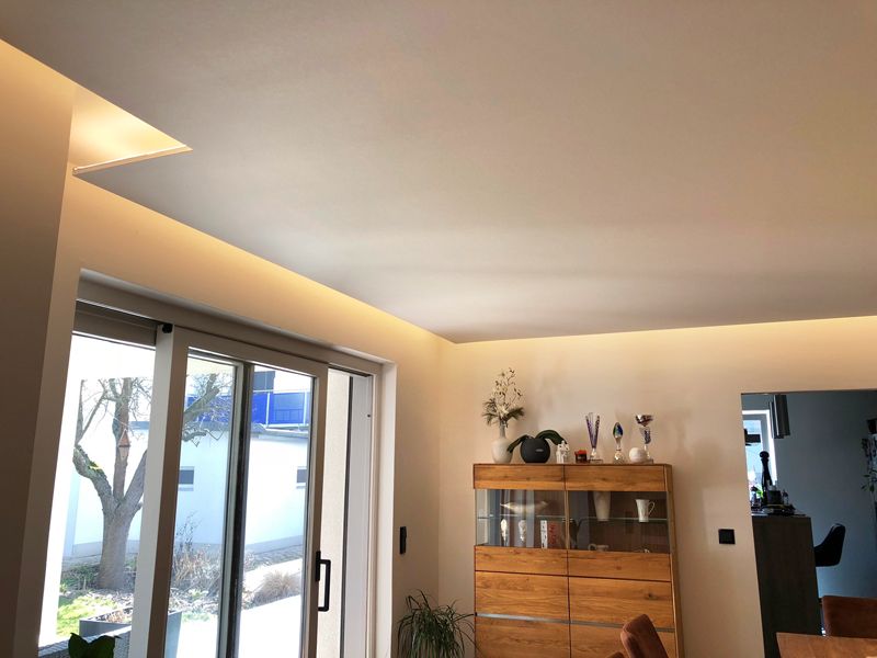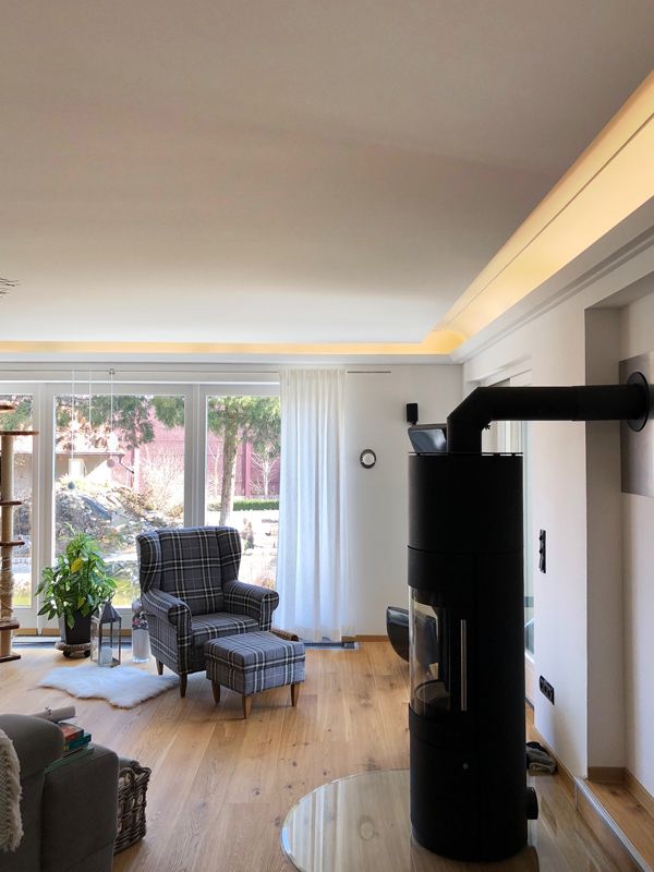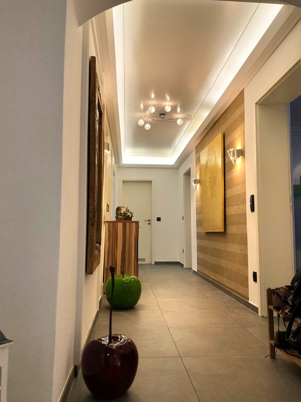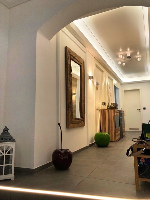 Die Leistungen beinhalteten das Abhängen von Decken sowie das Anbringen von Stuckbändern, um durch Lichtleisten Raumakzentuierungen zu schaffen. Neue Holzböden in Verbindung mit Steinoptik an den Wänden sorgten für zeitlosen Stil und Atmosphäre. Fantastic-Fleece-Tapeten und farbliche Elemente machten aus Wandflächen edle und exklusive Blickfänger.