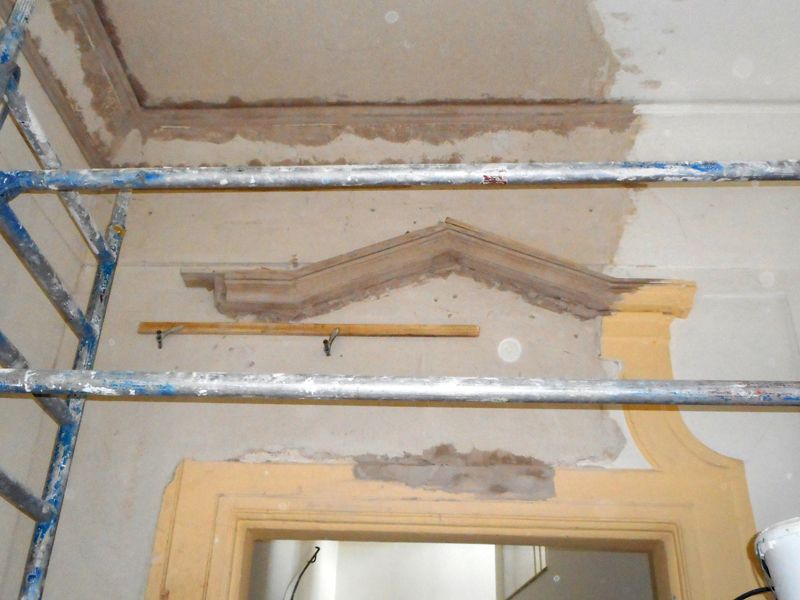 Fehlende Voute wurde ergänzt, mit Mehrfachfluat neutralisiert und abschließend mit Innensilikatfarbe vorgrundiert.
