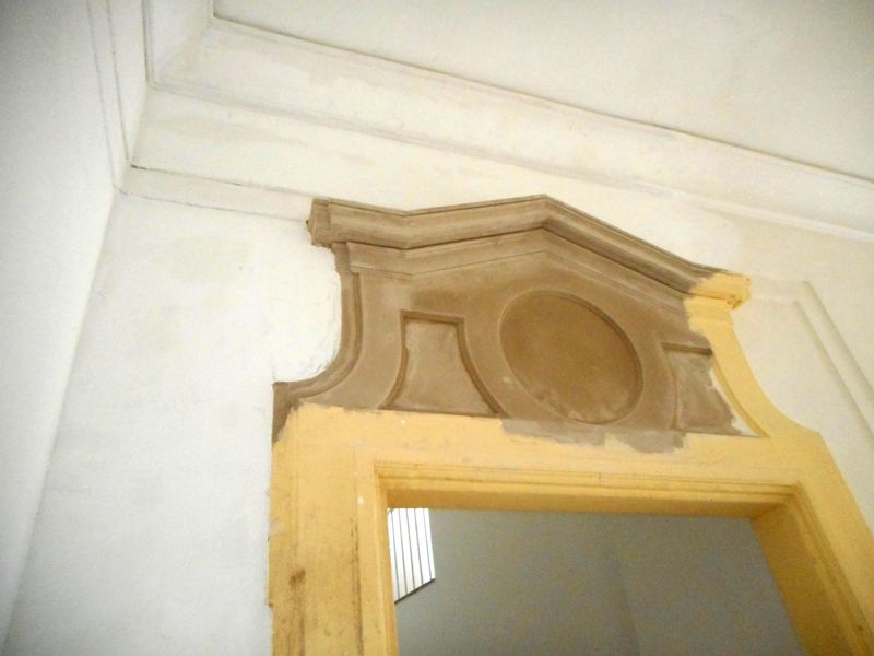 Eine runde Supraporte mit Spiegelfläche wurde neu hergestellt und nach Bestand zweifarbig gefasst. Noch vorhandene Fragmente wurden in die Anfertigung mit einbezogen.