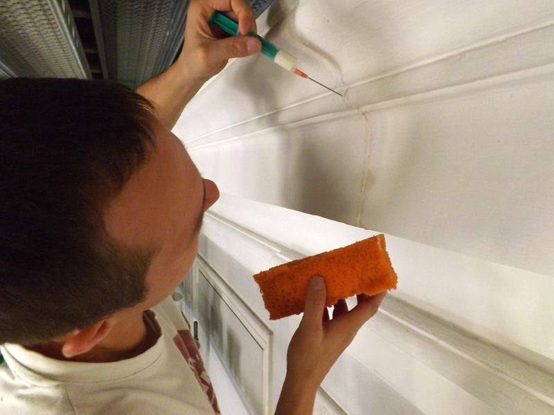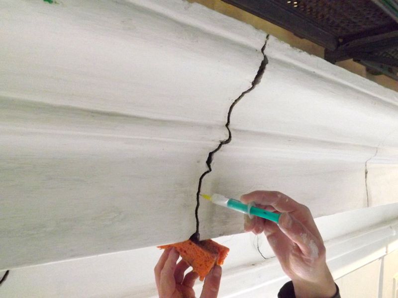 Haarrisse in Gewölbedecke und Gesims wurdenvorgenässt und kleinflächig nass in nass mit Injektionsmörtel verschlämmt.