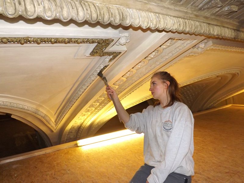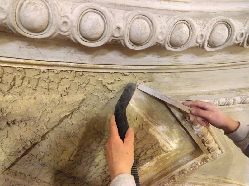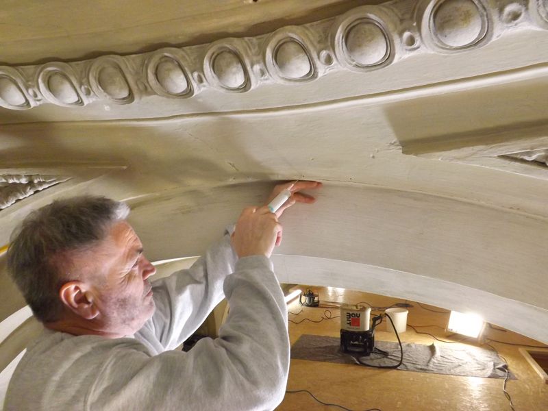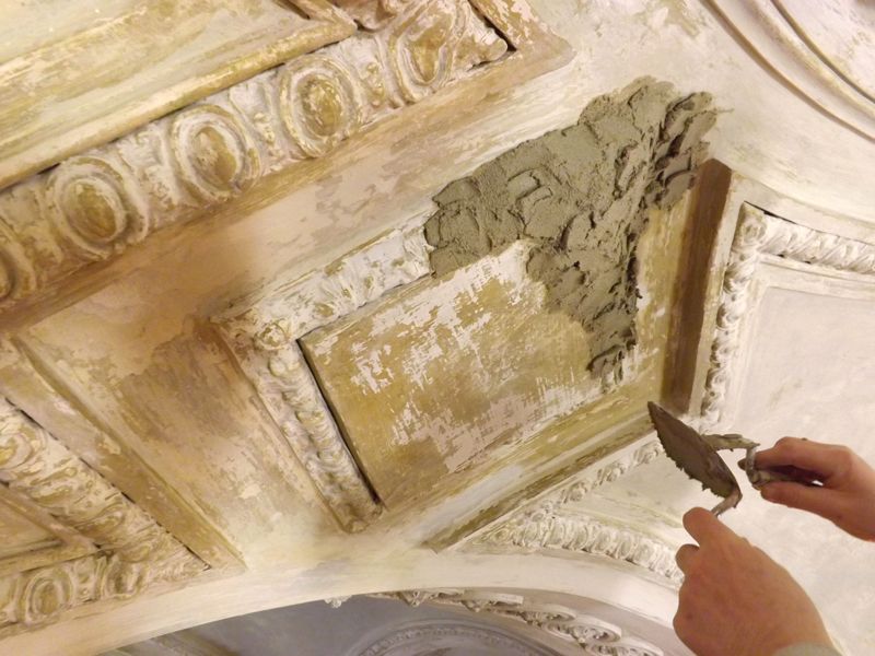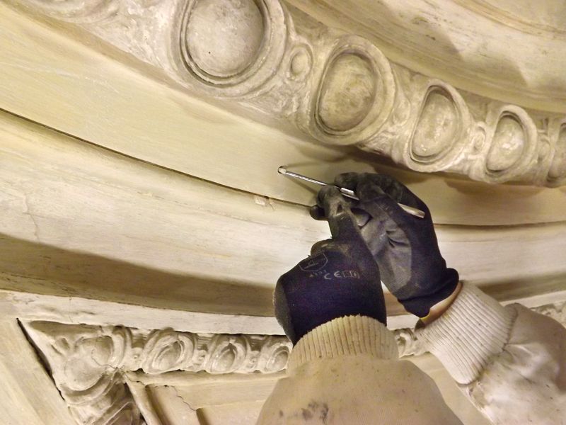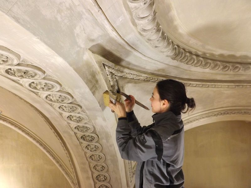 Optisch auffällige Fehlstellen im Stuck (ornamental und profiliert) und in den Rücklagenflächen wurden repariert. Alle Ausbrüche wurden in jeweils angepasstem Material und formengerecht geschlossen.
