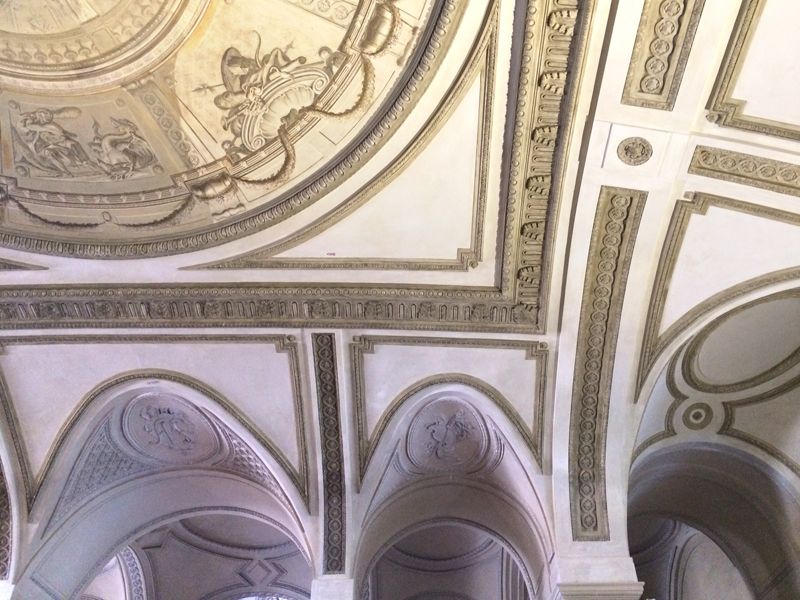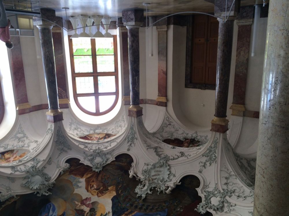Die gesamte Raumschale wurde neu gefasst. Wände und Gewölbe erhielten ein ein- bzw. zweilagiges Anstrichsystem. Die Bauzier wurde farblich abgesetzt.