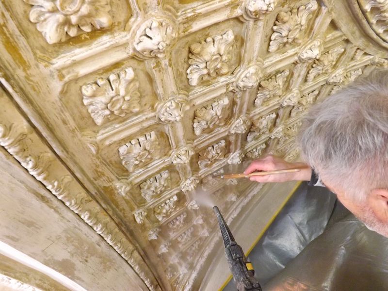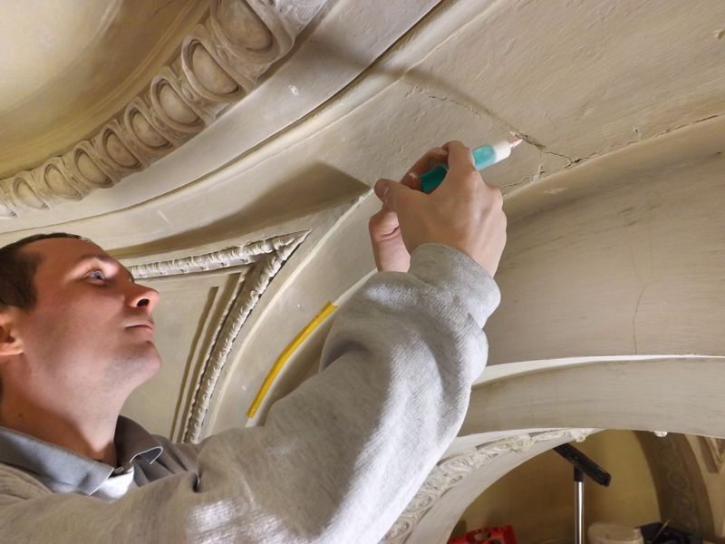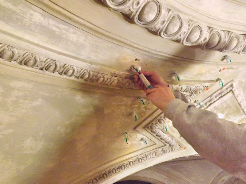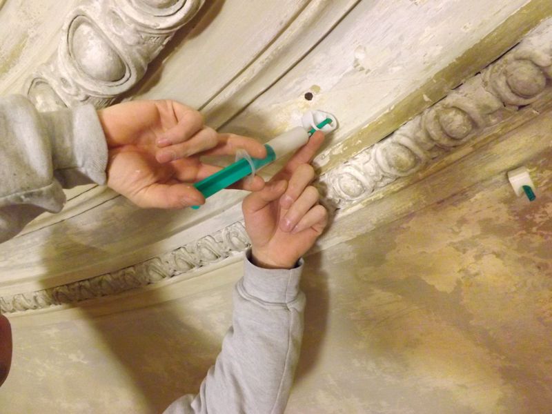 Abgelöste, bewegliche und gefährdete Rücklagenputze, Profilstuck und ornamentaler Antragsstuck wurden durch Hinterfüllen konsolidiert und konserviert. Die Injektionsöffnungen wurden in minimal nötiger Größe und bevorzugt an Rissmitten oder -kreuzen angelegt.