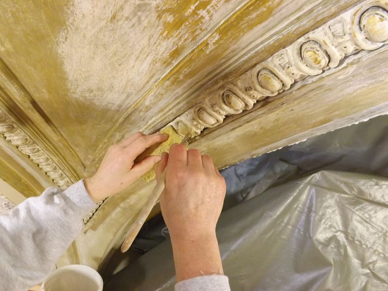 Fassungen auf salzkontaminiertem Sandstein im Sockelbereich wurden trocken mechanisch abgenommen.