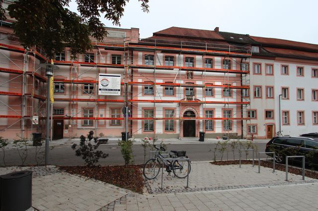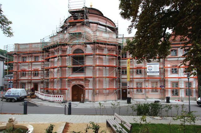 An der Fassade der ehemaligen Klosterkirche wurden vor Beginn der Sanierung und Restaurierung besondere Maßnahmen und Abdeckungen zum Schutz von angrenzenden Bauteilen vorgenommen. Auch Pflaster und Dach wurden fachgerecht abgedeckt.