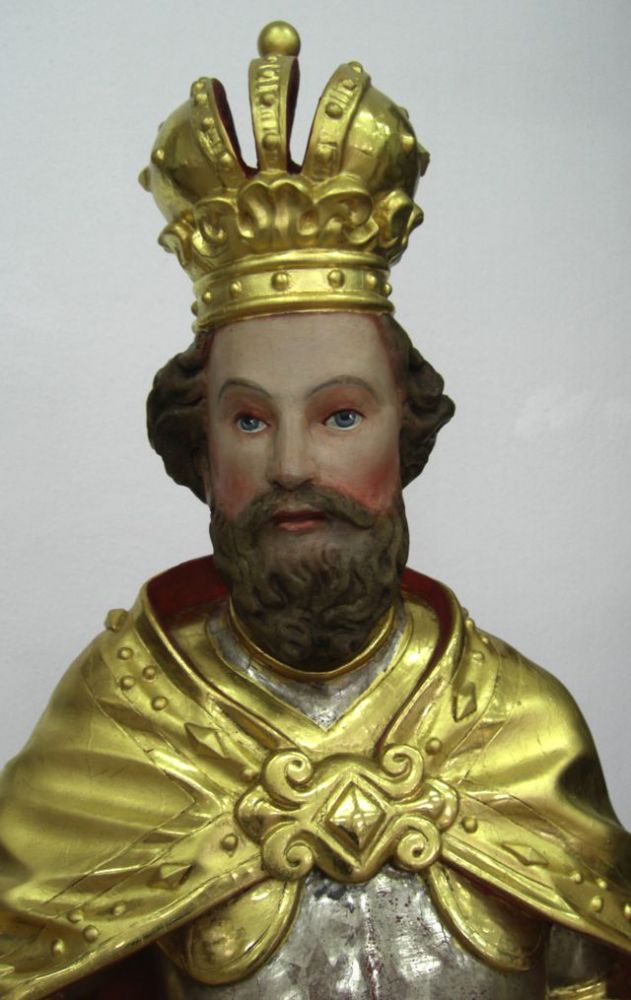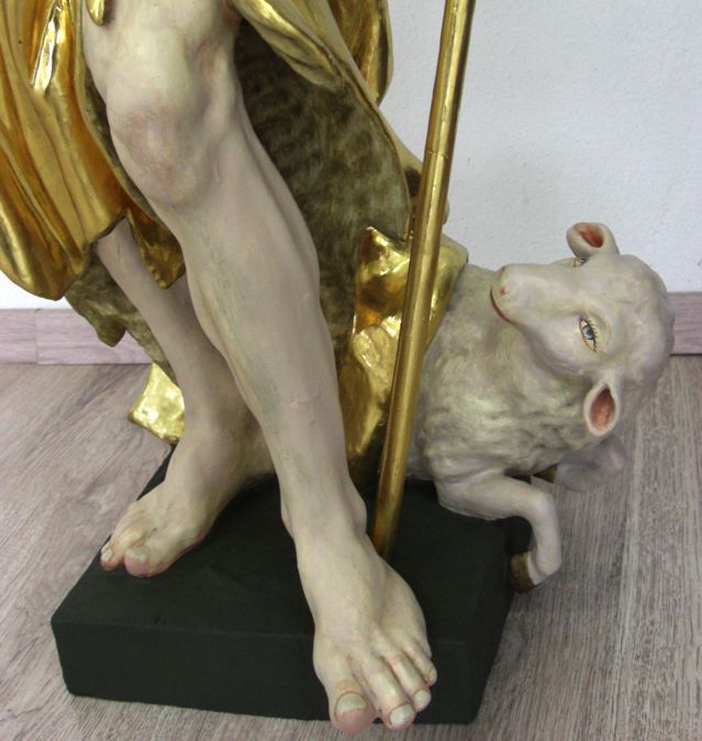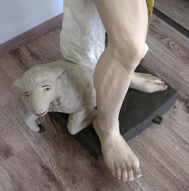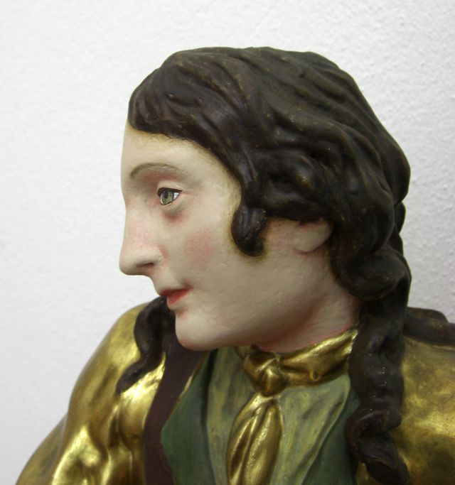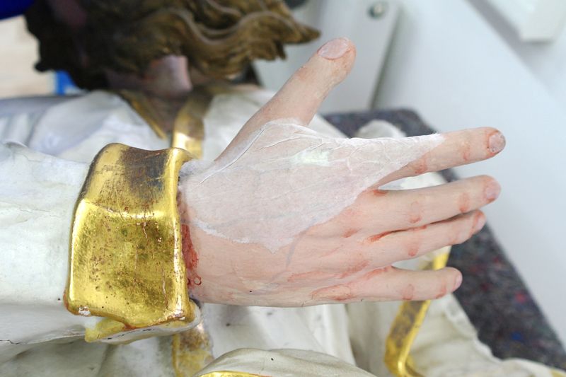 Eine Ausnahme bildete die Figur des Wendelin. Hier wurde das Inkarnat über einer Trennschicht überfasst, da das Gesicht aufgrund früherer Reinigungsmaßnahmen ausgeprägte Schäden aufwies.