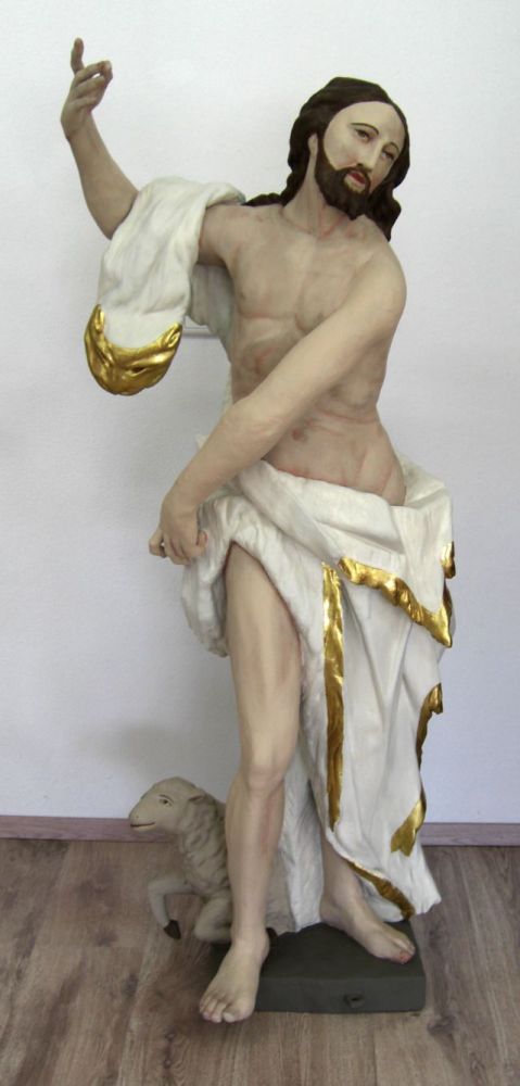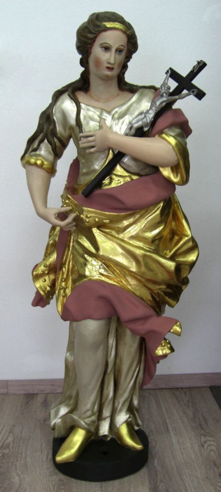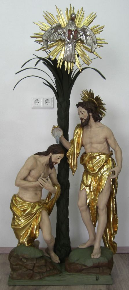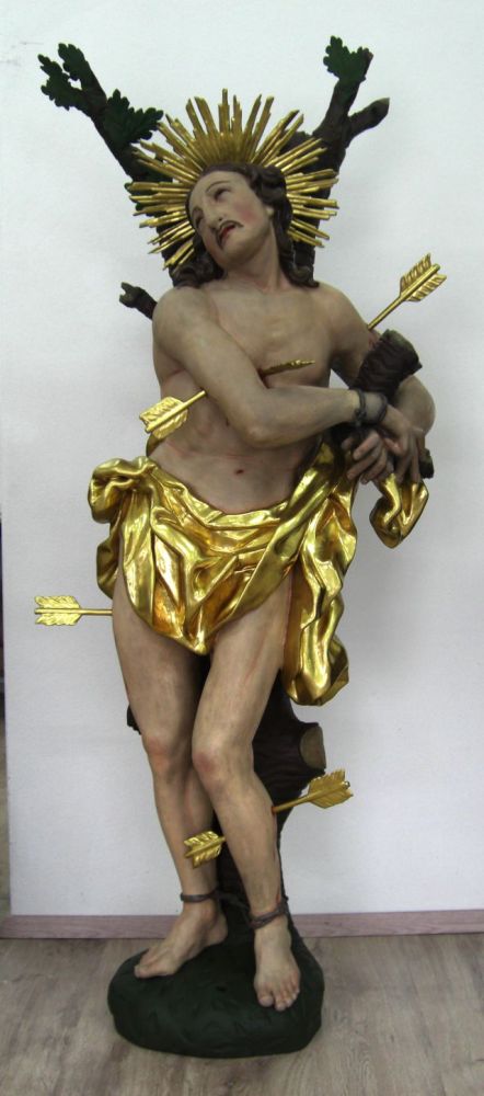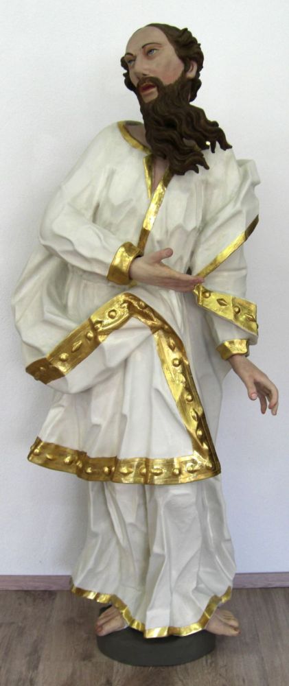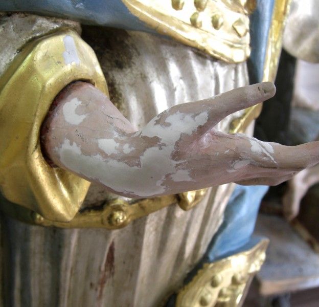 Die Figuren wurden ebenfalls in unser klimatisiertes Restaurierungsatelier transportiert. Die Verschmutzungen und Rußablagerungen der Figuren mit Polierweiß- und Goldfassung wurden gesondert gereinigt. Um die Polierung der Weißfassung durch die Reinigung nicht zu beeinträchtigen, wurde nicht bis zu einer absolut weißen Oberfläche gereinigt. Aufstehende Farbschollen wurden anschließend durch Hinterspritzen mit Hausenblasenleim gefestigt und niedergelegt. Formell fehlende Figurenteile wurden ergänzt, was sorgfältig in der entsprechenden Kartierung verzeichnet wurde. Fehlbereiche in der Fassung wurden mit Kreidekitt ausgekittet. Größere Bereiche wurden mit Kreidegrund neu aufgebaut und vorsichtig oberflächengleich verschliffen. Die Kittungen und offenen Kreidegrundschichten wurden dem Bestand entsprechend retuschiert, Farbtöne wurden entsprechend nachgemischt. Kittungen und offene Kreidegrundschichten im Goldbereich wurden im Polimentton grundiert und mit leimgebundenen Perlglanzpigmenten retuschiert. Die Restaurierung größerer Fehlbereiche erfolgte in angepasster Technik, d. h. je nach Umfeld als Polimentglanzgold oder als Ölvergoldung.