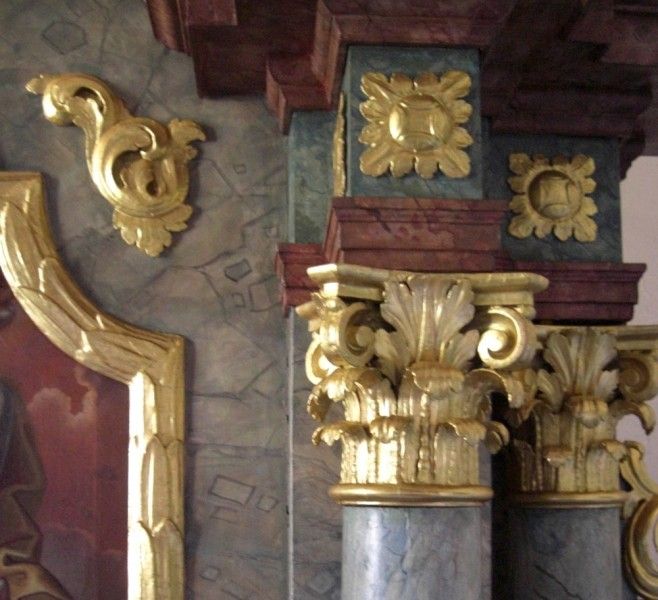 Anschließend wurden die Kittstellen in den Marmorierungen und Farbfassungen tongenau retuschiert. Kittstellen in der Goldfassung wurden im Polimentton vorgelegt und mit leimgebundenen Perlglanzpigmenten retuschiert. Größere Fehlbereiche wurden in angepasster Technik mit identischen Materialien ergänzt (Blattgold), was insbesondere den Sockelbereich des Hauptaltars betraf.