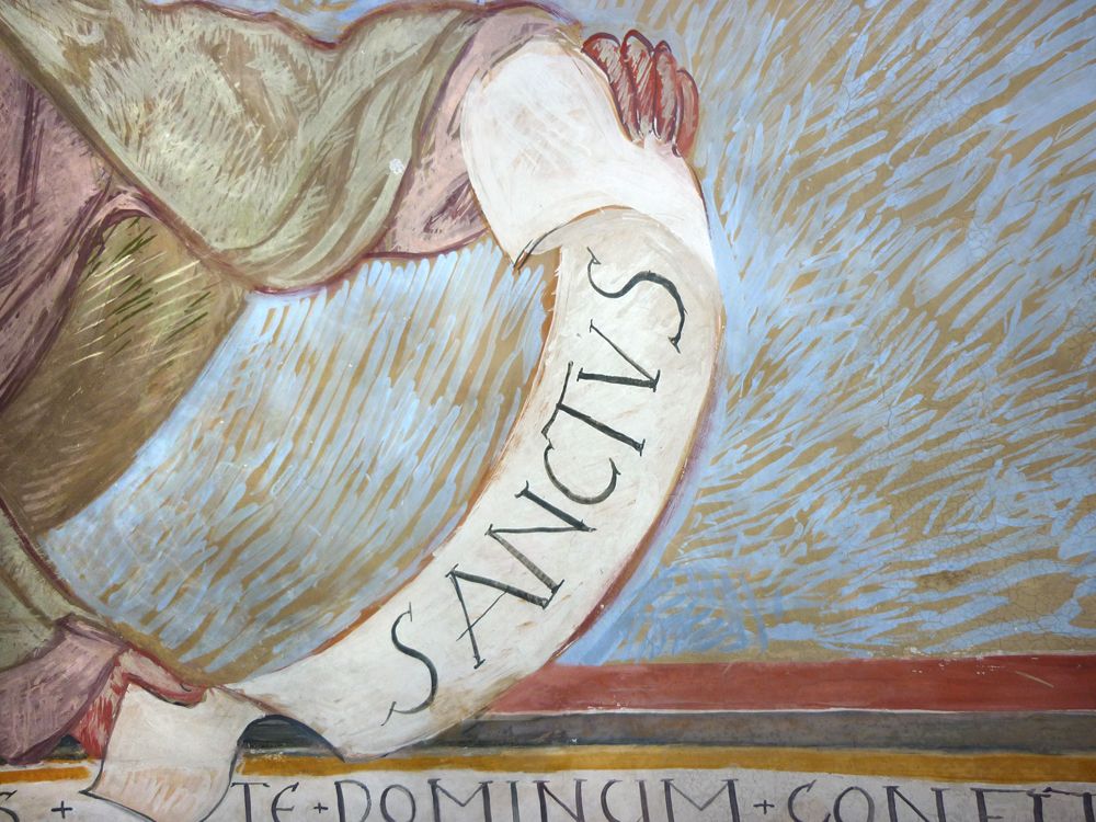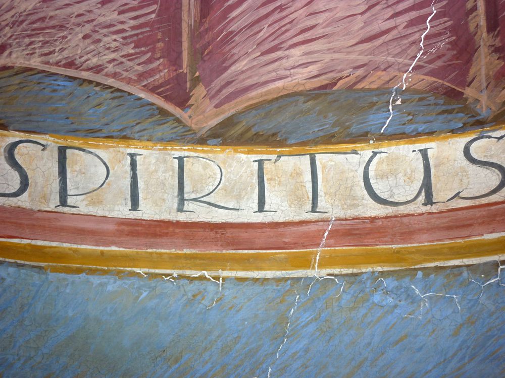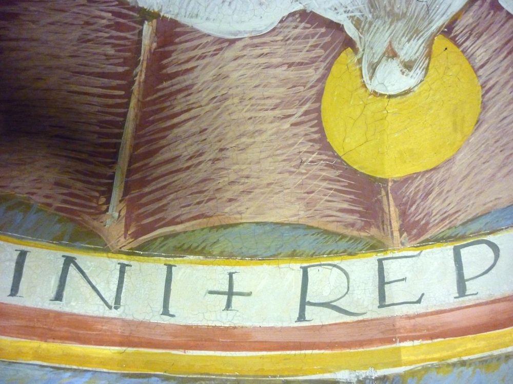Die Freskomalerei wurde mit akapad-Schwämmen vorsichtig trocken und anschließend mit Dampf leicht feucht gereinigt. Lockere und stark schwingende Hohlstellen erhielten eine Konsolidierung durch Hinterfüllen von dispergiertem Weißkalkhydrat (CalXnova), ohne dass eine Flächengewichterhöhung hervorgerufen wurde.