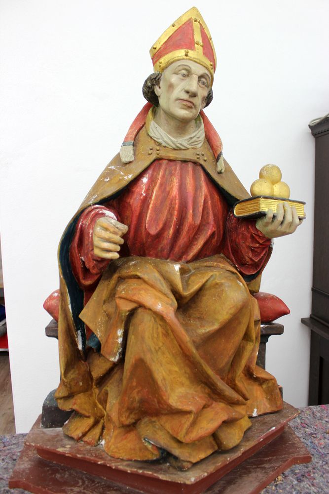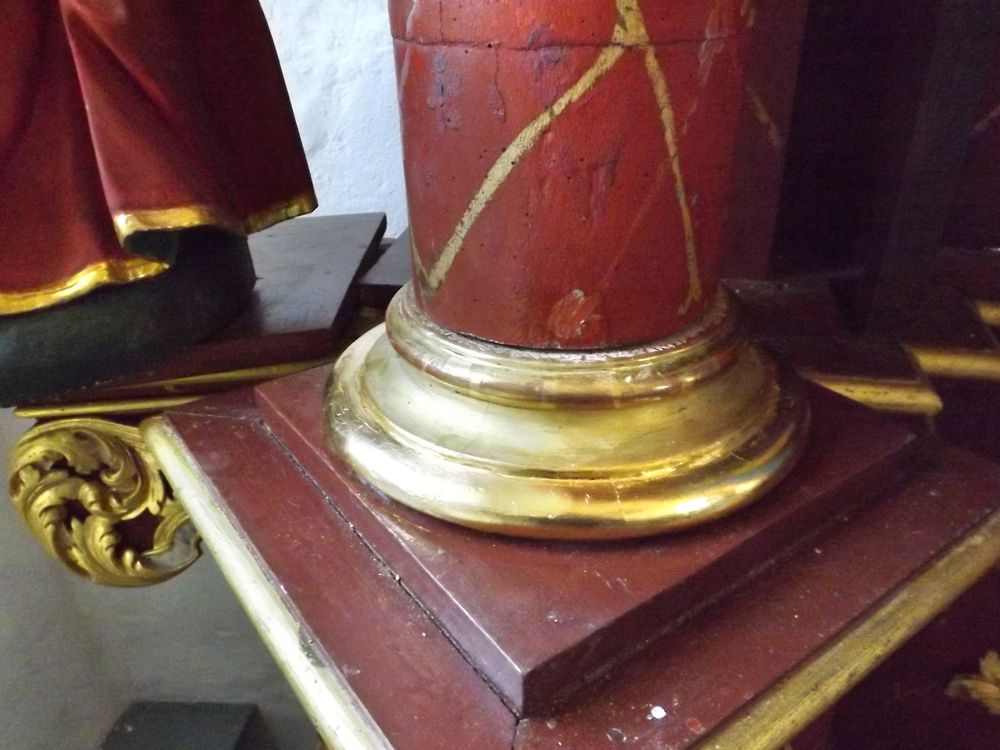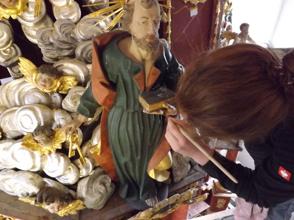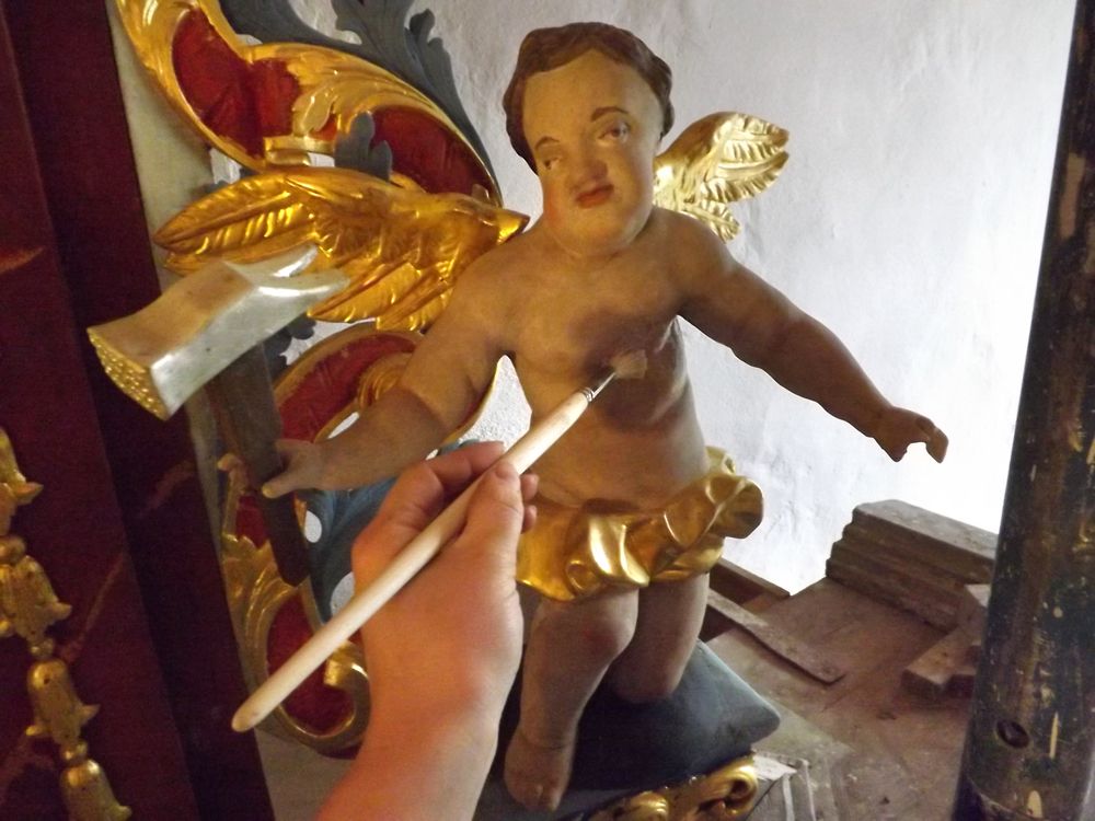 Nachdem sich herausgestellt hatte, dass sich die Figuren in einem äußerst schlechten Zustand befanden, wurden durch Insektenfraß geschädigte und destabilisierte Holzteile gefestigt. Nach der Reinigung der Oberflächen wurden die geschädigten Bereiche durch Einstreichen und Injektionen mit Paraloid bzw. Degalan getränkt. Anschließend wurden die Oberflächen nachgereinigt und überschüssiges Harz abgenommen. Auch wenn eine Durchfestigung nur bedingt möglich war, wurde in jedem Fall die Stabilität der Ornamente und Figuren wieder verbessert.