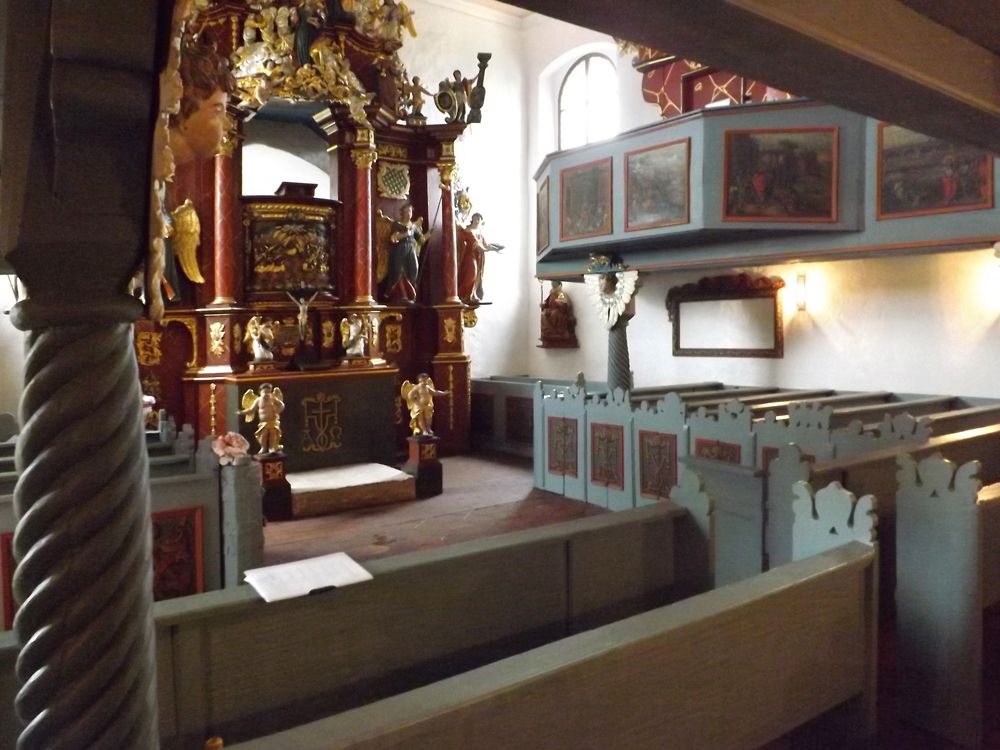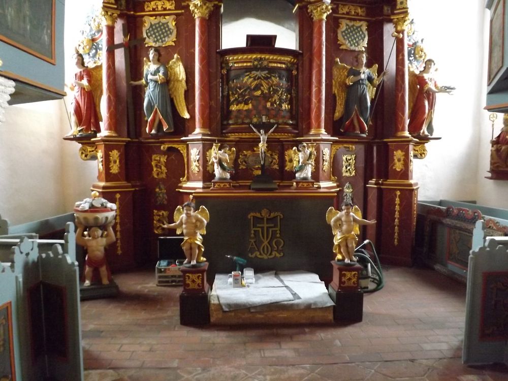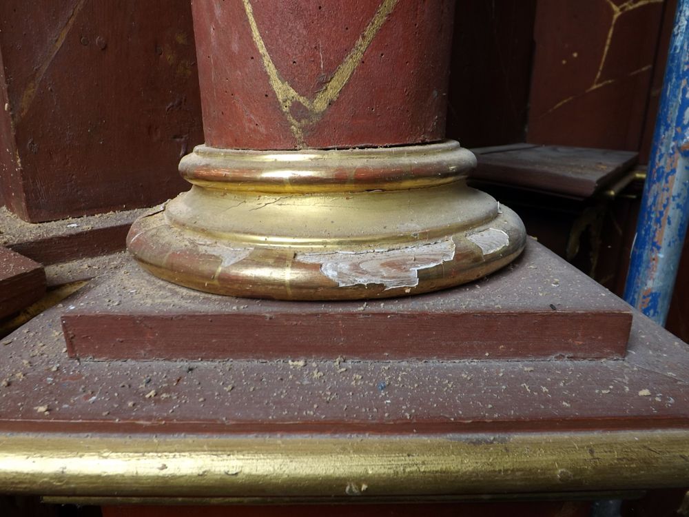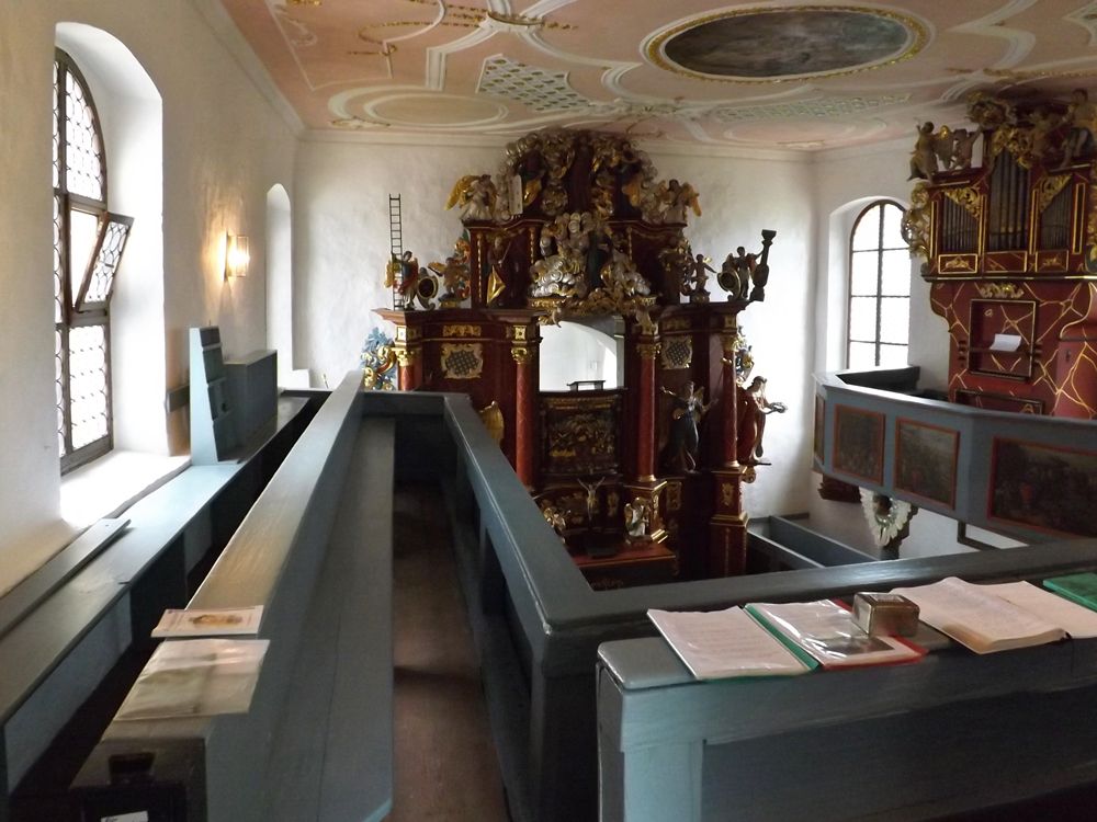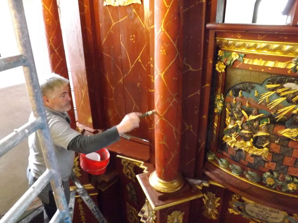 Die Emporenbrüstungen wurden außen und innen überarbeitet und aufgefrischt. Altanstriche wurden mit leichtem Anlauger gereinigt und nachgewaschen.