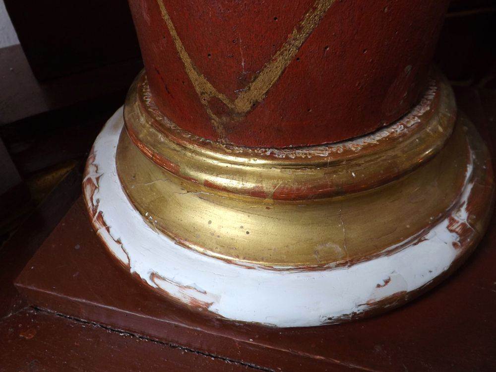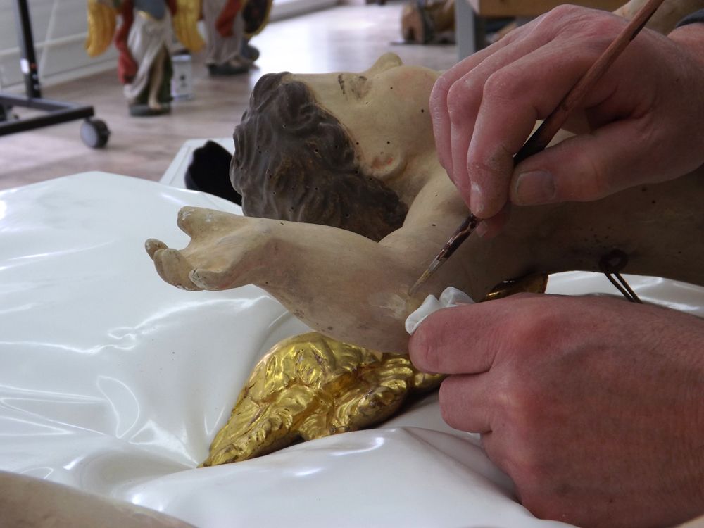 Fehlstellen in Vergoldung und Fassung wurden gekittet, in Oberfläche und Niveau an den Bestand angepasst und anschließend retuschiert.