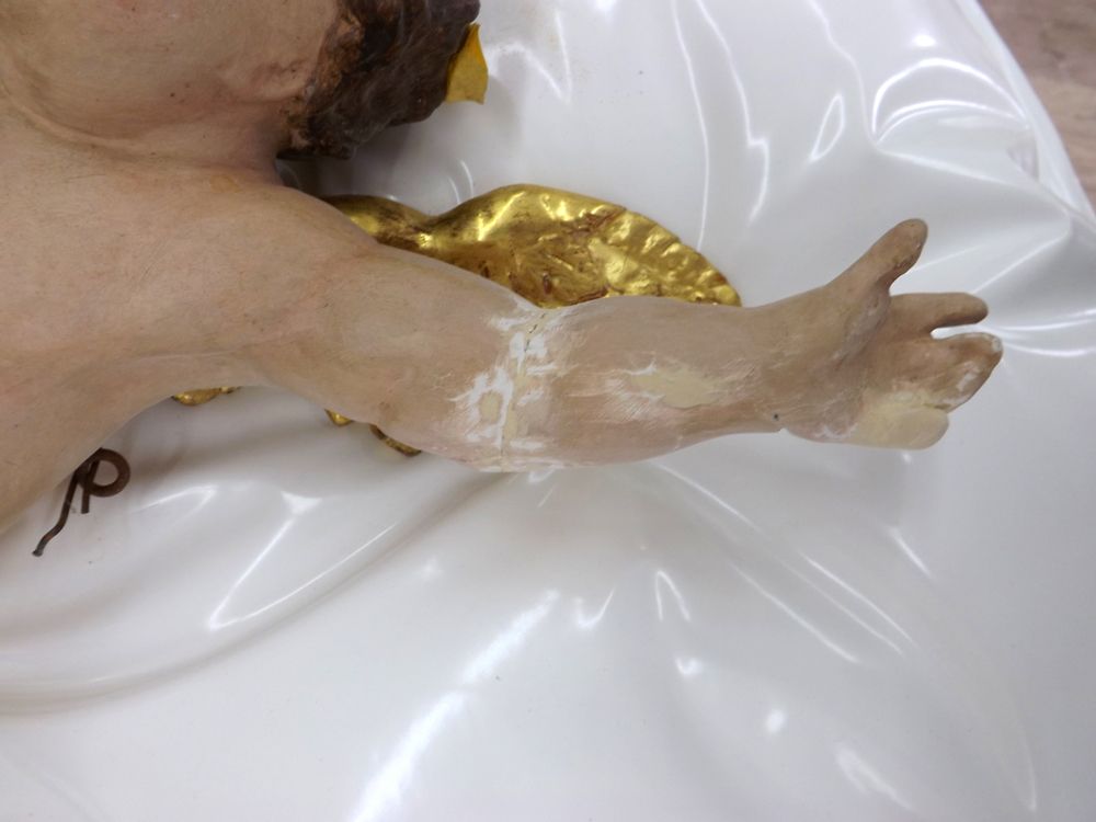 Zu Beginn war das Ziel der Maßnahme vor allem[nbsp]die Reinigung aller Ausstattungsgegenstände. Dann stellte sich heraus, dass sich die Figuren in einem äußerst schlechten Zustand befanden. Durch Insektenfraß geschädigt, waren viele Holzteile destabilisiert und gefährdet.