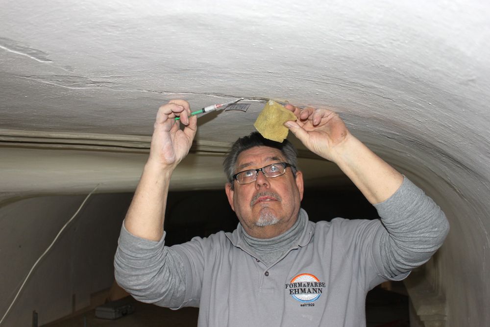 Die vielgestalten Schadensbilder zu Beginn der Maßnahmen bestanden beispielsweise aus buckliger Oberfläche der Wände, partiellen spannungsbedingten Ablösungen bei den historisch gewachsenen Putz- und Fassungssystemen, diversen Spuren früherer Sanierungsmaßnahmen, ausgeprägten bis massiven Rissbildern, Abrissen, Putzverlusten oder[nbsp]reduzierten Oberflächen durch Gebrauchsspuren -[nbsp]um nur einige zu nennen.