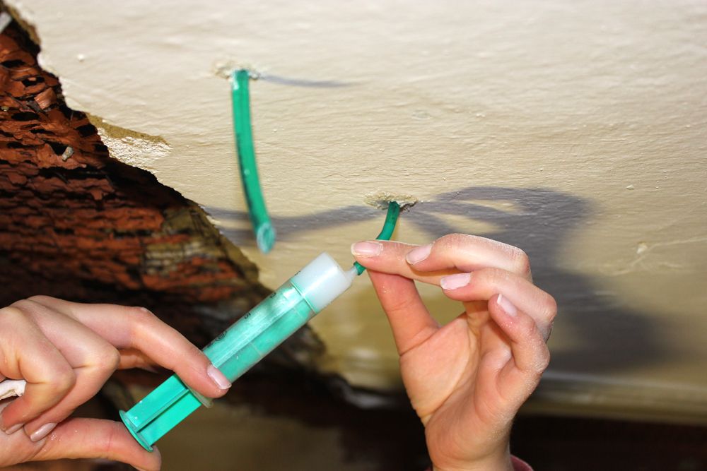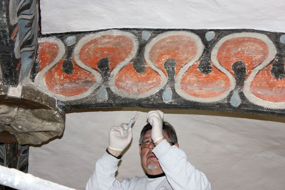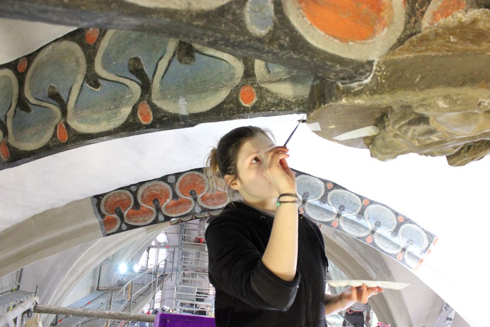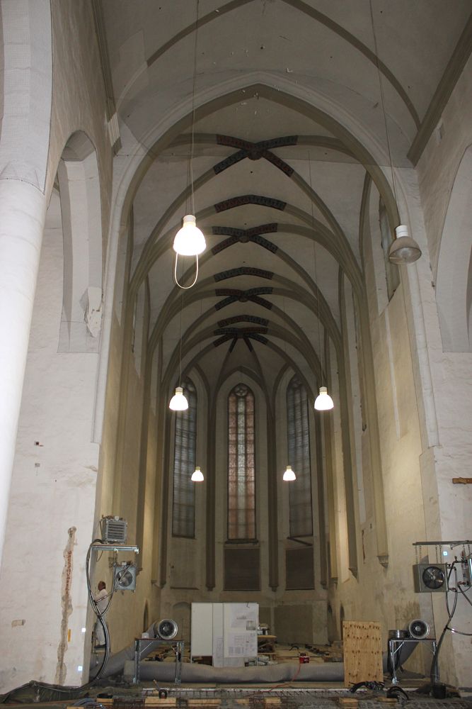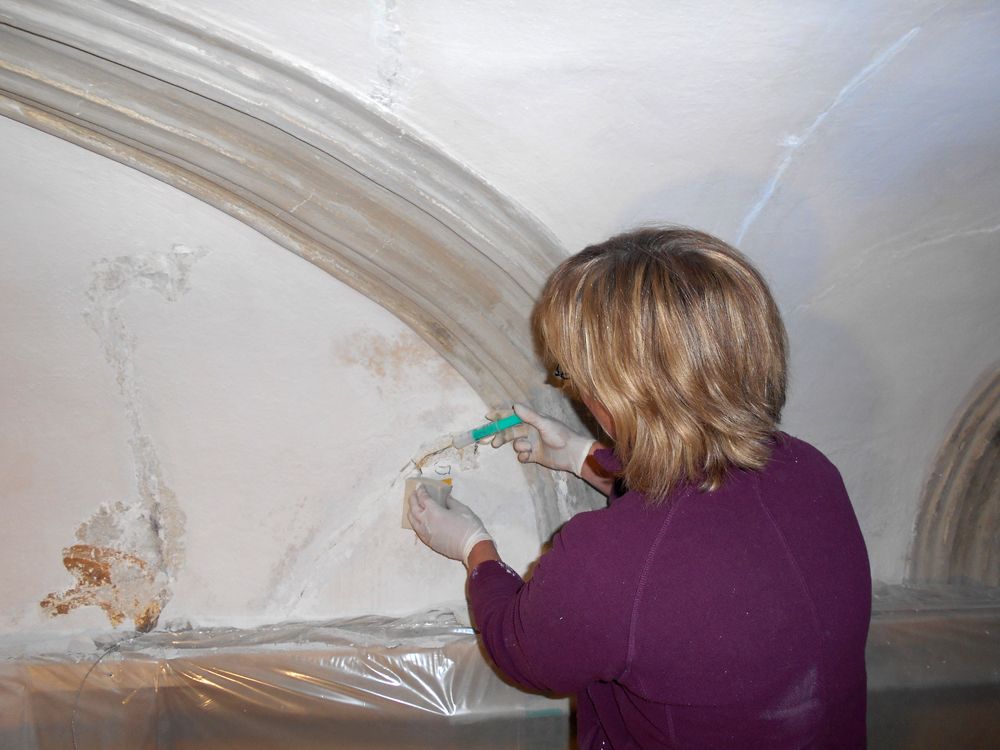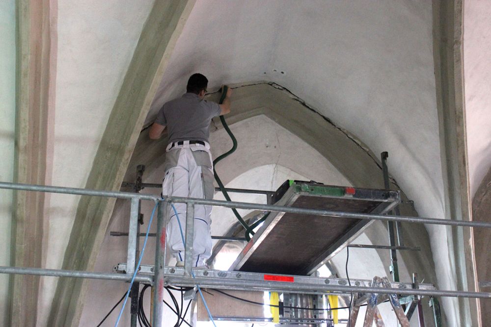 Einen besonderen Schwerpunkt bildete die technische Instandsetzung der Putzschalen an statisch vorgeschädigtem Mauerwerk bzw. auf Substruktionen aus Holz (Mittelschiffgewölbe/ Seitenschiffdecken) oder ausgemauertem Fachwerk (Obergaden Arkadenbögen). Die adhäsionsgeschwächten Strukturen wurden mittels Injektionsmörtel und Vernadelungen gefestigt, Risse wurden geschlossen.