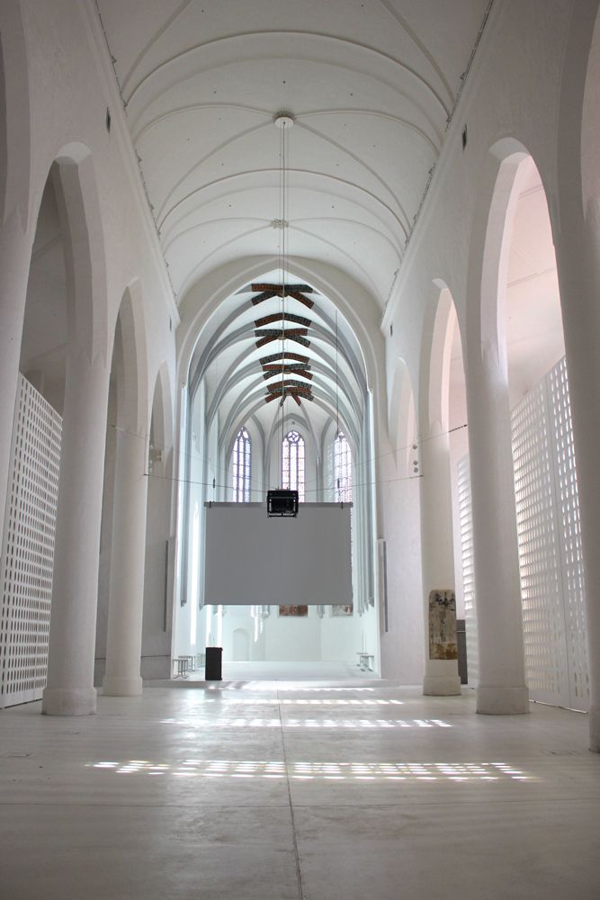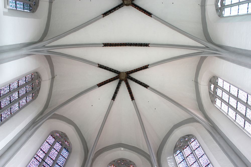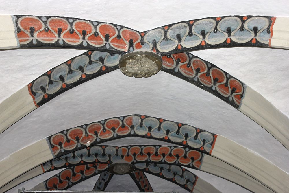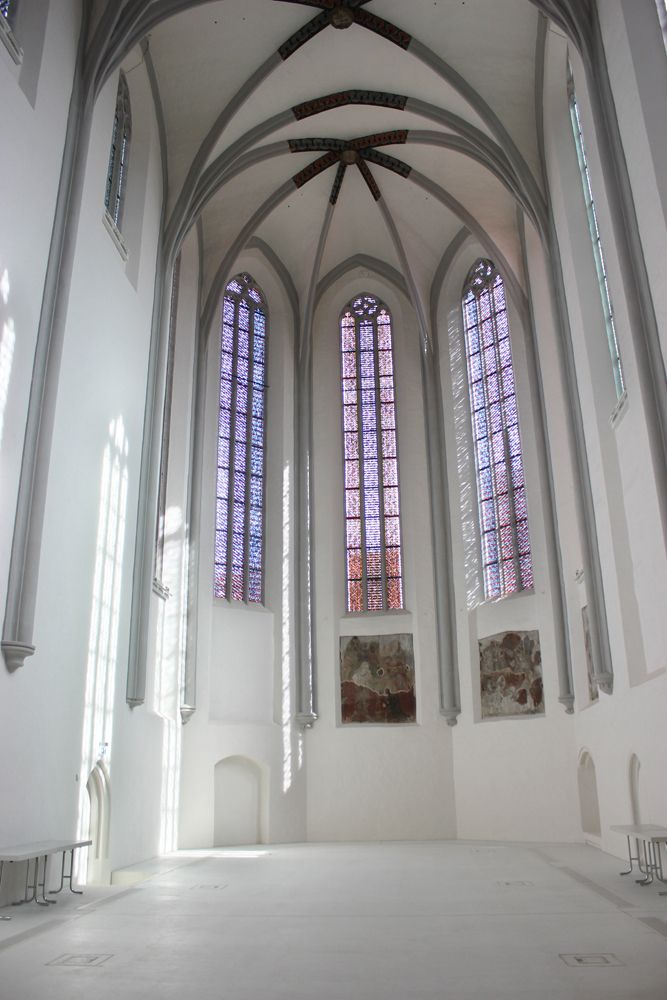 Die Architekturfassung der Raumschale wurde differenziert behandelt. Im Chor wurde die farbige Absetzung der spätmittelalterlichen Kreuzrippen, Dienste und Fenstermaßwerke tradiert, die farbigen Wellenband-Manschetten der Rippen reintegriert. Die neu abzufassenden Sandsteinrippen und Maßwerke wurden in einem kühlen Grau gegen die weiße Raumschale abgesetzt. Der weiß zu fassende Chorbogen stellt die Zäsur dar und leitet in das monochrom weiße Langhaus über.
