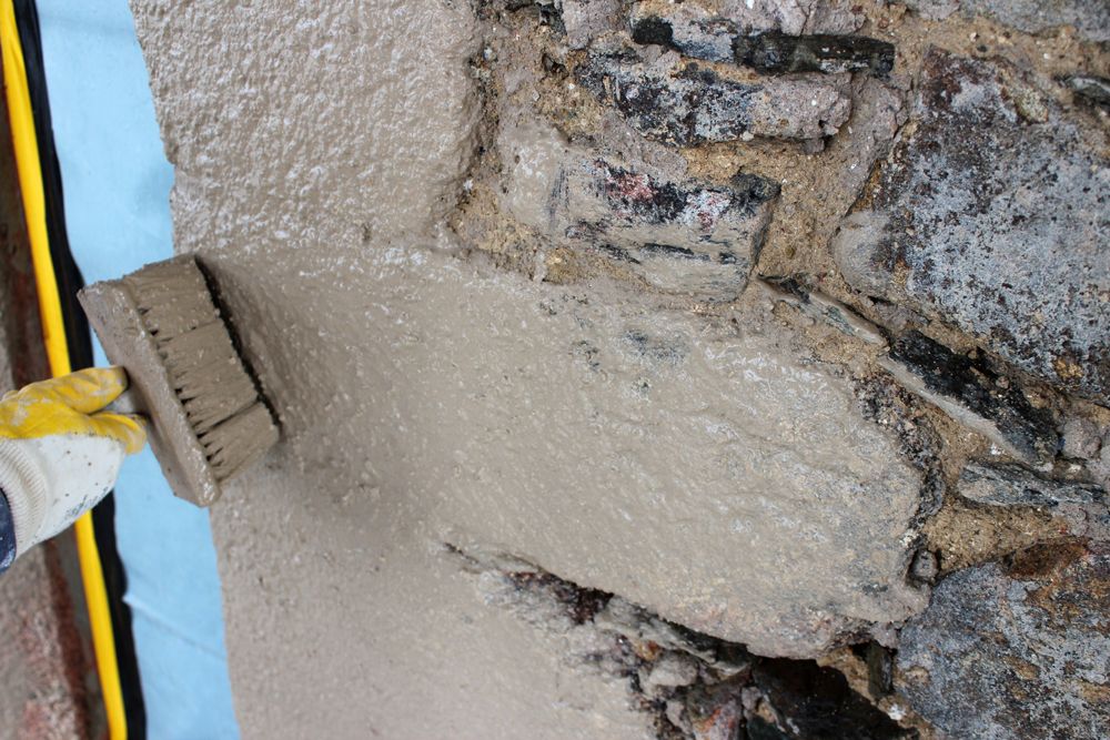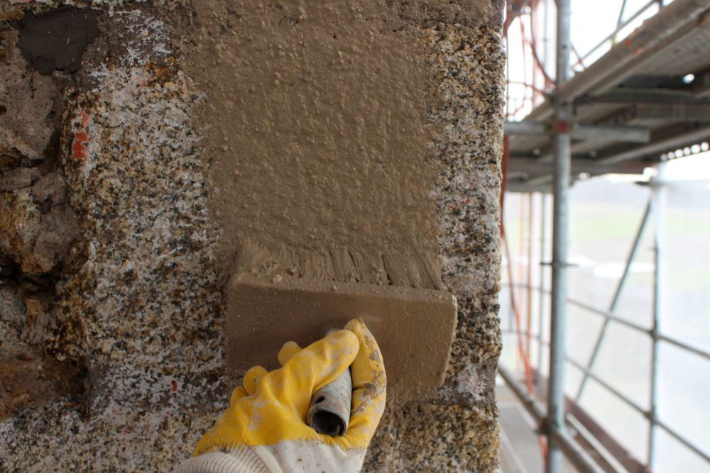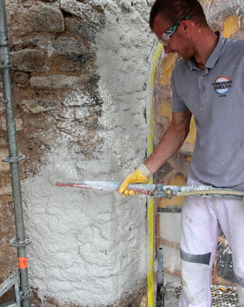 Anschließend folgte der Spritzbewurf mit Vorspritzmörtel (RCP Salzspeicherputz SPI) in igelartiger Form. Ziel der Applikation war die Herstellung einer guten Haftbrücke. Da es sich beim Trägermaterial um Bruchsteinmauerwerk handelt, wurde davon ausgegangen, dass unterschiedliches Material Verwendung gefunden hatte. Daher wurde der Spritzputz vollflächig angetragen.