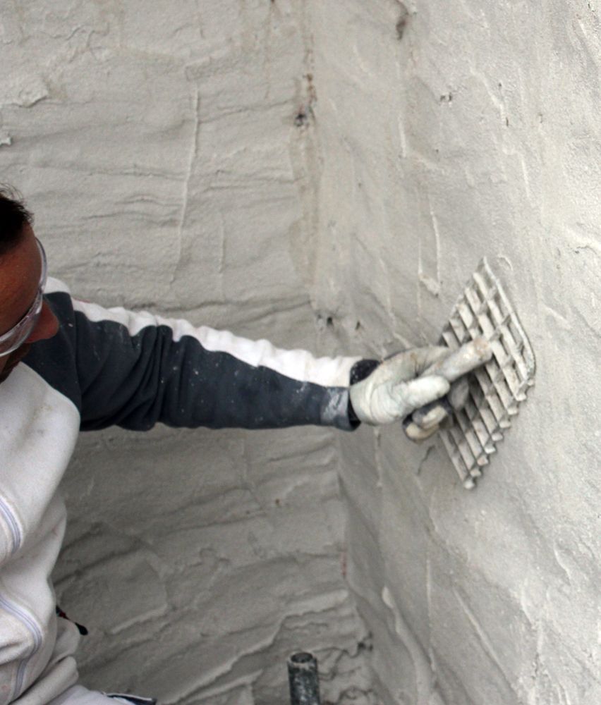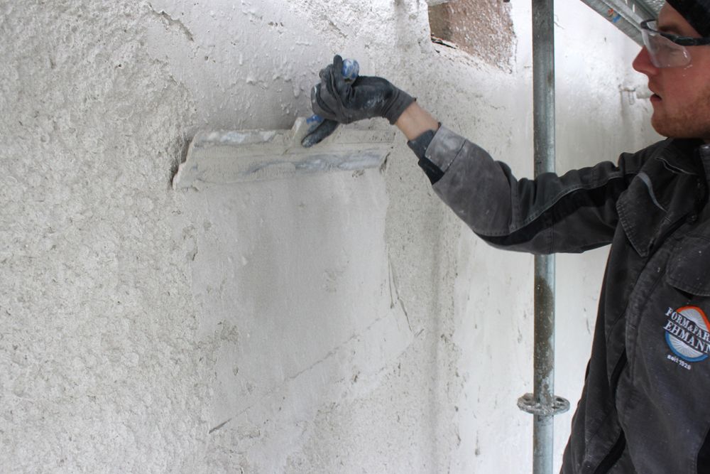 Vertiefungen mit mehr als 50 mm Tiefe wurden vorgenässt und vorab von Hand in Kellenwurftechnik vorgeworfen und als Untergrundvorbereitung ausgeglichen.