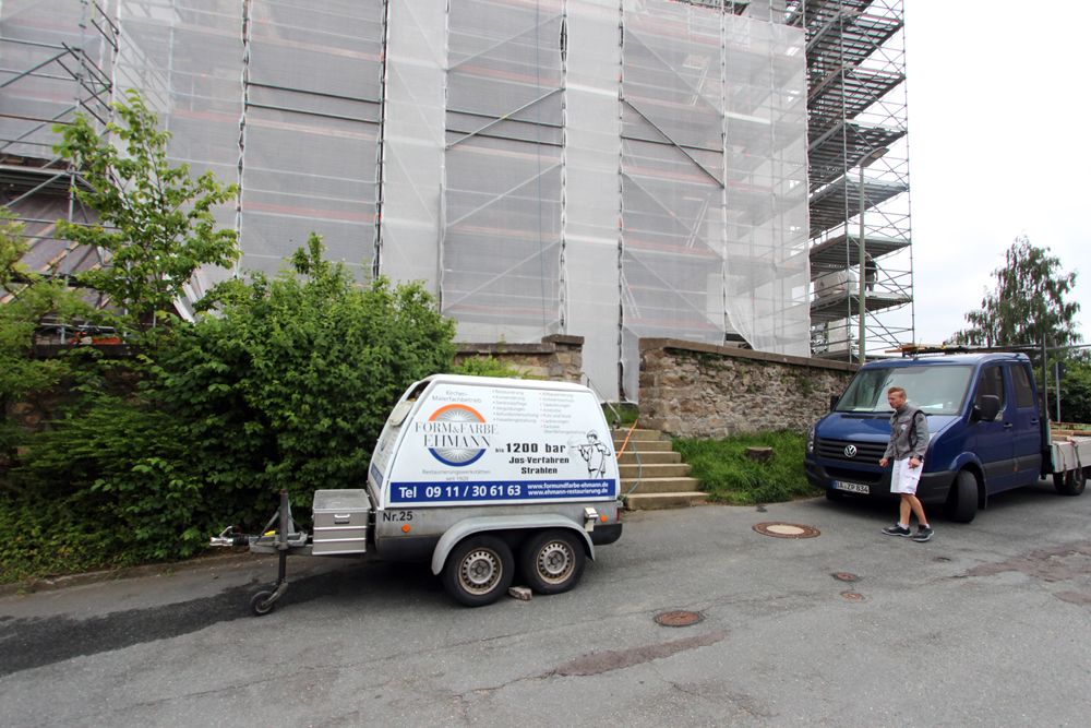 Um ein Aufbrennen des Mörtels zu verhindern, wurden abschnittsweise die Gerüstinnenflächen an den zu bearbeitenden Fassadenbereichen mit Vlies abgehängt. Die Abhängung wurde in einem Abstand von 30 cm zur Fassade am Gerüst befestigt, sodass ein geschlossener, aber hinterlüfteter Schutzvorhang entstand. Diese Abhängung wurde durchgängig feucht gehalten.