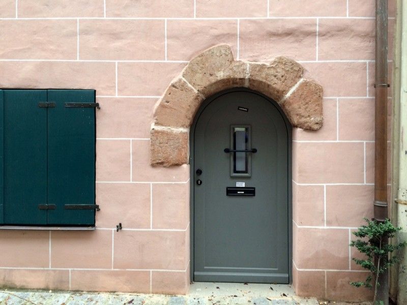 Für den nachfolgenden Gefachputz wurden die Fachwerkhölzer durch zweimaligen lasierenden Anstrich mit Ölfarbe auf Basis von Naturölen vorbereitet. Der Anstrich erfolgte in Putzstärke auf der Innenseite der Fachwerkhölzer. Putzarbeiten an den Gefachen der Fachwerkwände Der Außenputz auf den Typha-Gefachen wurde von uns als hoch diffusionsoffener Putz ausgeführt. Der Vorspritzmörtel bestehend aus Einkorn-Tuffsand, der sparsam mit einer Luftkalk-Zementmilch benetzt wurde, wurde nicht deckend netzartig auf den Untergrund aufgeworfen. Nach einer Standzeit von 1 bis 2 Tagen wurde der Grundputz aus kapillarsaugendem, gelöschten Luftkalkmörtel ohne Traß- oder Zementzugabe von Hand aufgebracht, waage- und senkrecht mit Latten abgezogen und am Anschluss an die anderen Fachwerkhäuser mit feinem Kellen- oder Messerschnitt versehen. Nach Ansteifung wurde die Putzoberfläche für die Carbonatisierung und nachfolgende Haftung mit Putzkamm aufgeraut. Der Oberputz ebenfalls aus Luftkalkmörtel wurde genauso aufgebracht, jedoch abgefilzt. Die Oberflächenstruktur wurde mit Haarfilz kornbündig gestaltet, sodass keine Feinanteile auf der Putzoberfläche lagen.