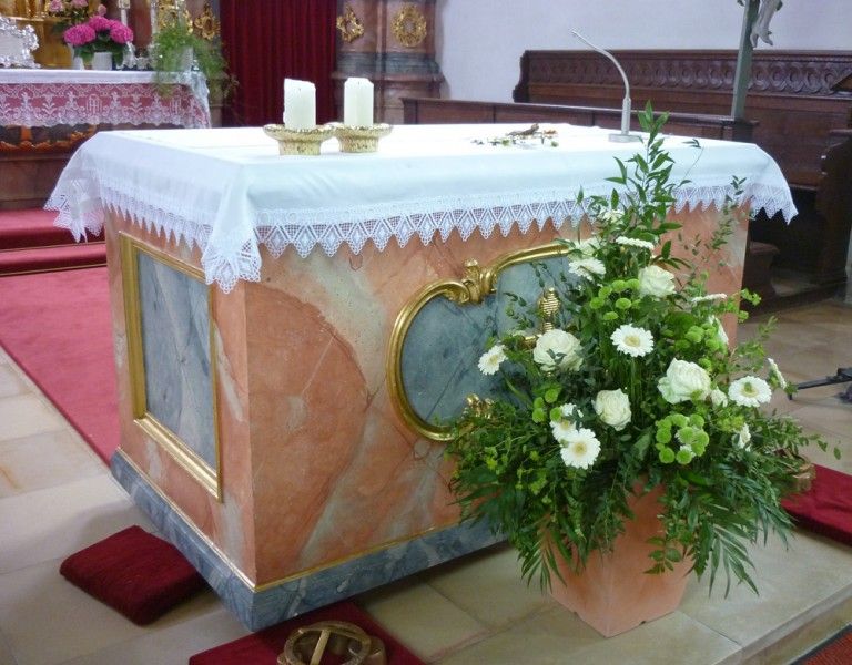 Bewegliches Inventar wie Skulpturen, Gemälde und Vortragekreuze wurden in unsere klimastabilen Atelierräume ausgelagert. Das verbleibende, fest eingebaute Ausstattungsmobiliar wurde diffusionsoffen, staubdicht abgedeckt.