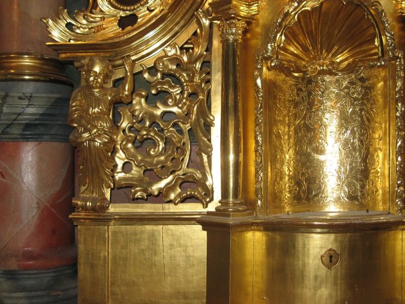 Anschließend erfolgte die trockene Oberflächenreinigung der Fassung und Vergoldungen aller Ausstattungsgegenstände mit akapad-Schwämmen. Wachsspritzer wurden entfernt.